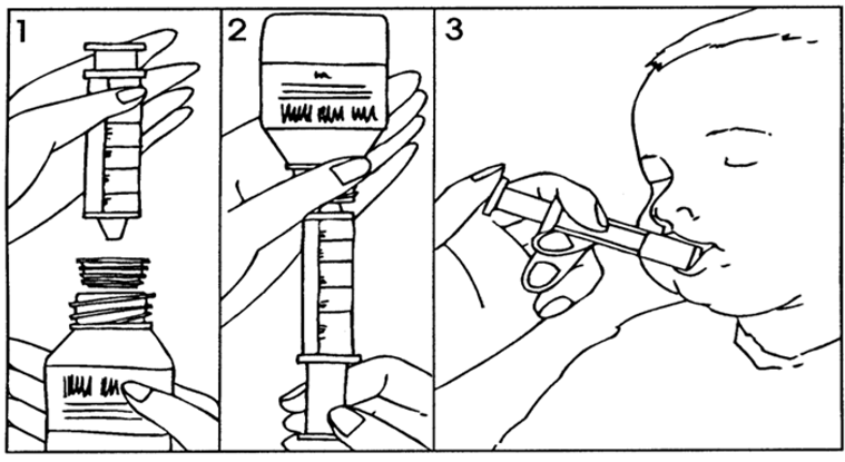 Das Arzneimittel kann direkt aus der Spritze in den Mund gegeben werden. Der Patient sollte während der Einnahme aufrecht sitzen. Die Spritze dazu in das Innere der Wange richten und die Suspension langsam in den Mund des Patienten fließen lassen (Abbildung 3).