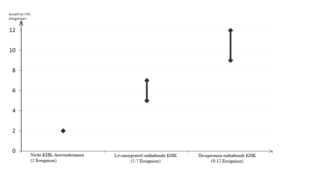 Ungefähr 2 von 10.000 Frauen, die kein KHK anwenden und nicht schwanger sind, erleiden im Verlauf eines Jahres eine VTE. Bei einer einzelnen Frau kann das Risiko jedoch in Abhängigkeit von ihren zugrunde liegenden Risikofaktoren bedeutend höher sein (siehe unten). Es wird geschätzt Diese Inzidenzen wurden aus der Gesamtheit der epidemiologischen Studiendaten abgeleitet, wobei relative Risiken der verschiedenen Arzneimittel im Vergleich zu Levonorgestrel‑haltigen KHK verwendet wurden. , dass im Verlauf eines Jahres 9 bis 12 von 10.000 Frauen, die ein Drospirenon‑haltiges KHK anwenden, eine VTE erleiden; im Vergleich hierzu kommt es pro Jahr bei ungefähr 6 Mittelwert der Spannweite 5 – 7 pro 10.000 Frauenjahre, auf der Grundlage eines relativen Risikos für Levonorgestrel-haltige KHK versus Nichtanwendung von ungefähr 2,3 bis 3,6 von 10.000 Frauen, die ein Levonorgestrel‑haltiges KHK anwenden, zu einer VTE.