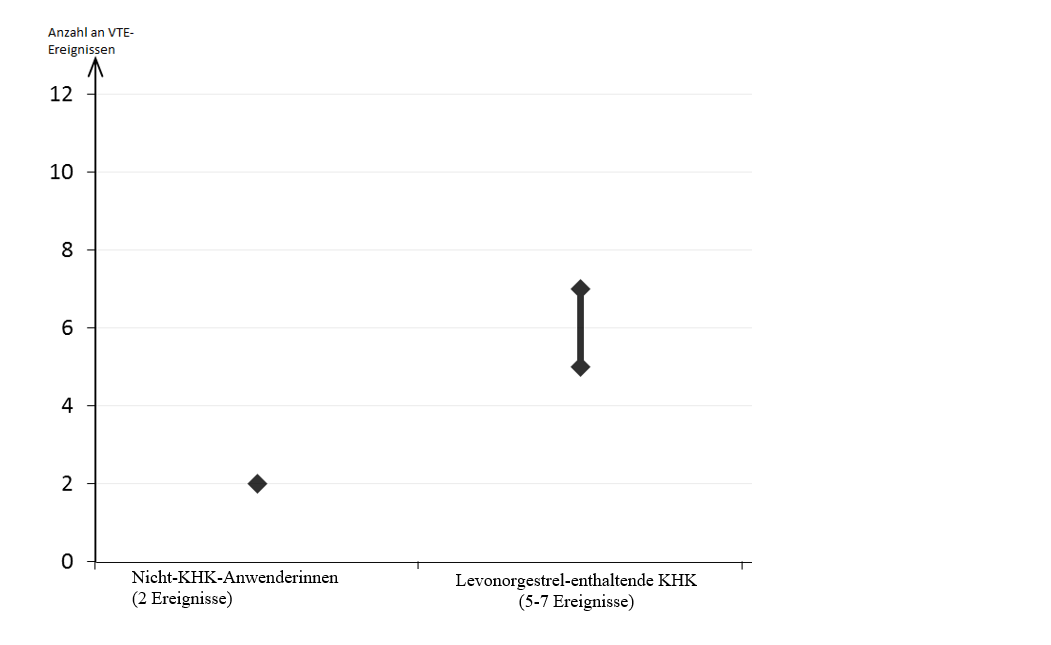 Ungefähr 6 Mittelwert der Spannweite 5-7 pro 10.000 Frauenjahre, auf der Grundlage eines relativen Risikos für Levonorgestrel-haltige KHK versus Nichtanwendung von ungefähr 2,3 bis 3,6 von 10.000 Frauen, die ein Levonorgestrel‑haltiges KHK anwenden, erleiden im Verlauf eines Jahres eine VTE.