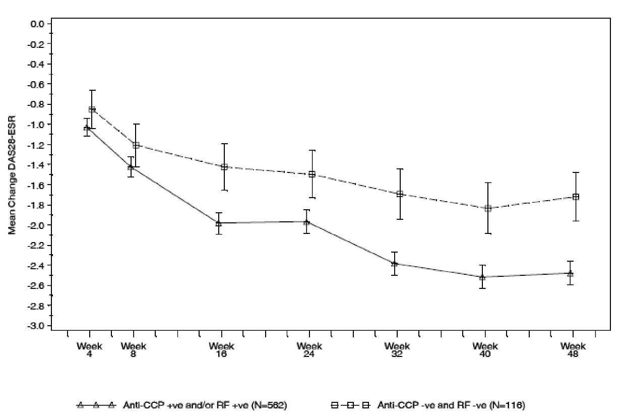 Die pharmakokinetischen Parameter in der Patientenpopulation, die ungenügend auf eine Anti-TNF-Behandlung angesprochen hatte, waren nach Anwendung des gleichen Therapieschemas (2 x 1 000 mg i.v. im Abstand von 2 Wochen) ähnlich und beliefen sich auf 369 µg/ml für die durchschnittliche maximale Serumkonzentration und 19,2 Tage für die durchschnittliche terminale Halbwertszeit.