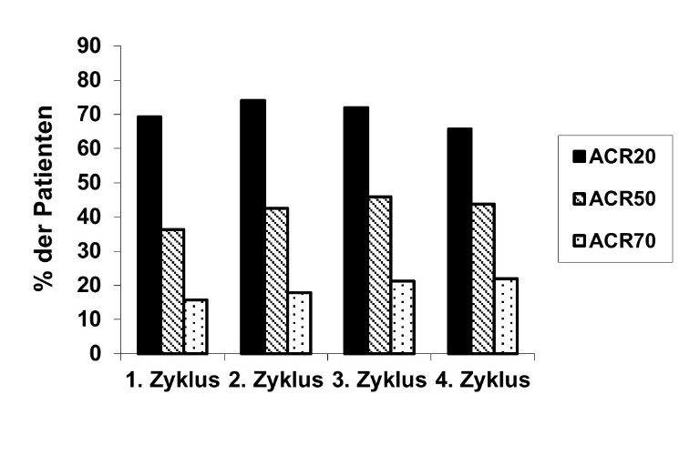 Die zur Verfügung stehenden Daten lassen darauf schließen, dass ein klinisches Ansprechen in der Regel innerhalb von 16 - 24 Wochen nach einem ersten Behandlungszyklus erreicht wird. Bei Patienten, die während dieses Zeitraums keine Anzeichen für einen therapeutischen Nutzen zeigen, sollte eine Fortführung der Behandlung sorgfältig überdacht werden.