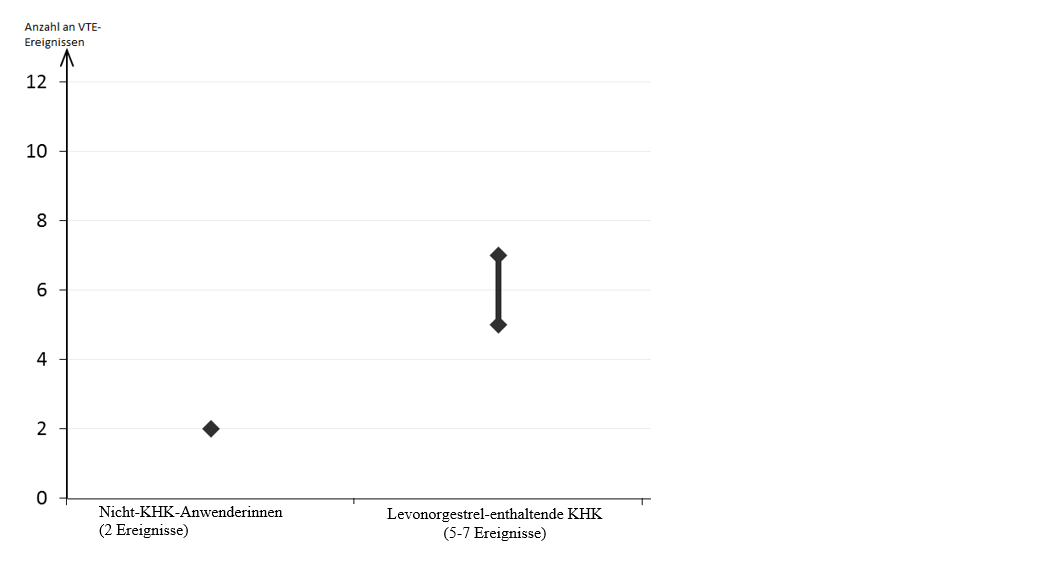 Ungefähr 6 Mittelwert der Spannweite 5-7 pro 10.000 Frauenjahre, auf der Grundlage eines relativen Risikos für Levonorgestrel-haltige KHK versus Nichtanwendung von ungefähr 2,3 bis 3,6 von 10.000 Frauen, die ein Levonorgestrel‑haltiges KHK anwenden, erleiden im Verlauf eines Jahres eine VTE.
