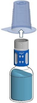 Entfernen Sie die Kappen von beiden Durchstechflaschen, um den mittleren Teil des Gummistopfens freizulegen (Abb. 1). Reinigen Sie die Gummistopfen der Durchstechflaschen für das Pulver und das Lösungsmittel mit einem Desinfektionsmittel.