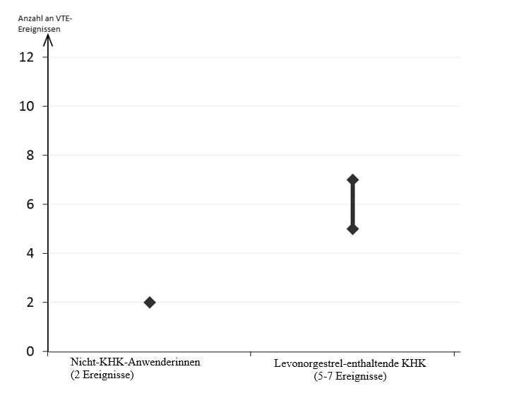 Ungefähr 6 Mittelwert der Spannweite 5-7 pro 10.000 Frauenjahre, auf der Grundlage eines relativen Risikos für Levonorgestrel-haltige KHK versus Nichtanwendung von ungefähr 2,3 bis 3,6 von 10.000 Frauen, die ein Levonorgestrel‑haltiges KHK anwenden, erleiden im Verlauf eines Jahres eine VTE.