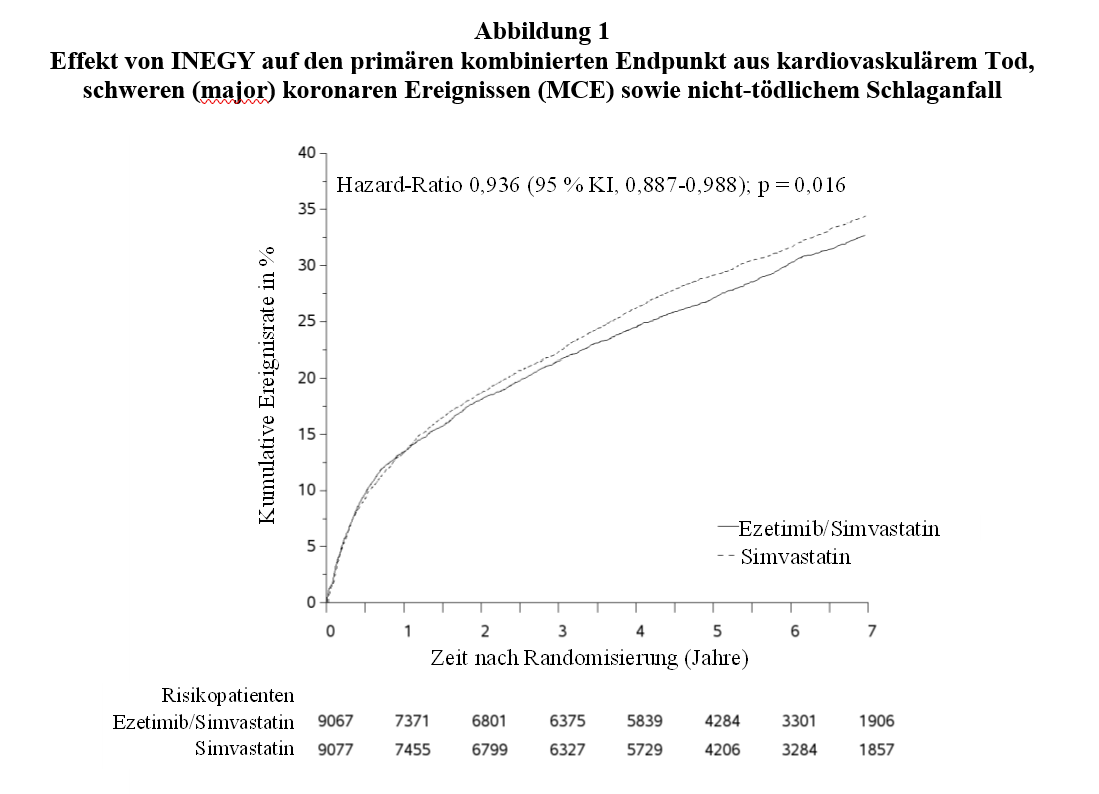 Im Vergleich zu Plazebo führte die Kombination von 10 mg Ezetimib und 40 mg Simvastatin nicht zu einer signifikanten Verringerung des Risikos für MCE.