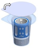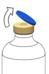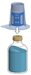 Stellen Sie die Lösungsmittelflasche auf eine ebene Fläche. Setzen Sie den blauen Teil des Transfersystems im Blister gerade auf die aufrecht stehende Durchstechflasche mit dem Lösungsmittel (Abb. 3), bis es einrastet. Das Transfersystem nicht drehen!