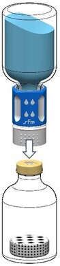 Nach Lösen des Pulvers (wie oben beschrieben) die beigefügte Spritze mit dem Luer-Lock-Anschluss auf den weißen Teil des Transfersystems schrauben, der noch in der Durchstechflasche mit dem gelösten Pulver steckt (Abb. 7). Anschließend lässt sich das gelöste Präparat problemlos in die Spritze aufziehen. Ein separater Filter ist nicht nötig, da das Transfersystem einen integrierten Filter besitzt.