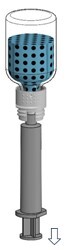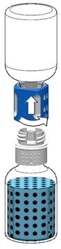Drehen Sie die Einheit aus dem Transfersystem und der Durchstechflasche mit dem Lösungsmittel auf den Kopf und stechen Sie den Adapter mit dem Dorn seines weißen Teils senkrecht in den Stopfen der aufrecht stehenden Durchstechflasche mit dem Pulver (Abb. 5), bis es einrastet. Durch das in der Durchstechflasche mit dem Pulver vorhandene Vakuum läuft das Wasser in diese Durchstechflasche.