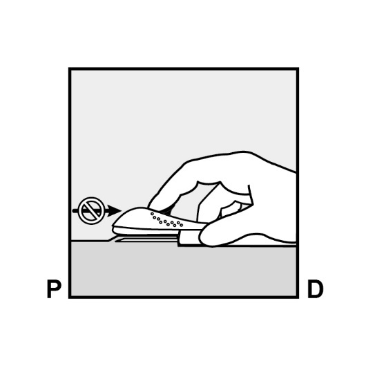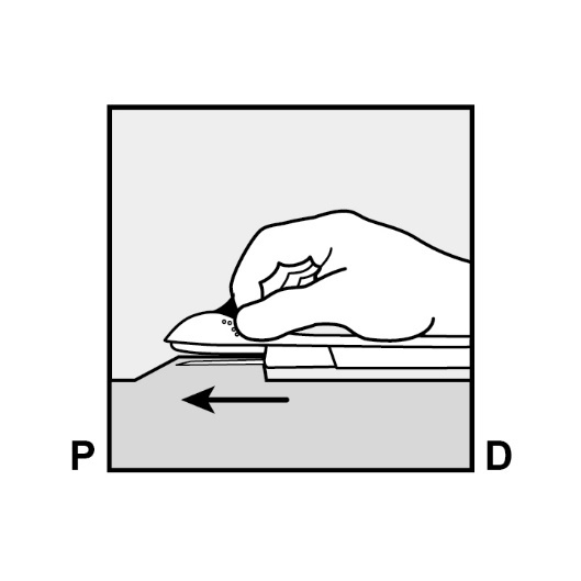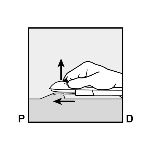 Fassen Sie den Applikator genau oberhalb der Nadel an der strukturierten Oberfläche. Entfernen Sie die transparente Schutzkappe von der Nadel, indem Sie diese horizontal in Pfeilrichtung wegschieben (Abbildung 3). Sollte sich die Schutzkappe nicht mühelos entfernen lassen, darf der Applikator nicht verwendet werden. Mit einem Blick in die Nadelspitze sollten Sie das weiße Implantat sehen. Berühren Sie nicht den lila Schieber, bis Sie die Nadel komplett unter die Haut eingeführt haben, da dadurch die Nadel zurückgezogen und das Implantat zu früh aus dem Applikator freigesetzt würde.