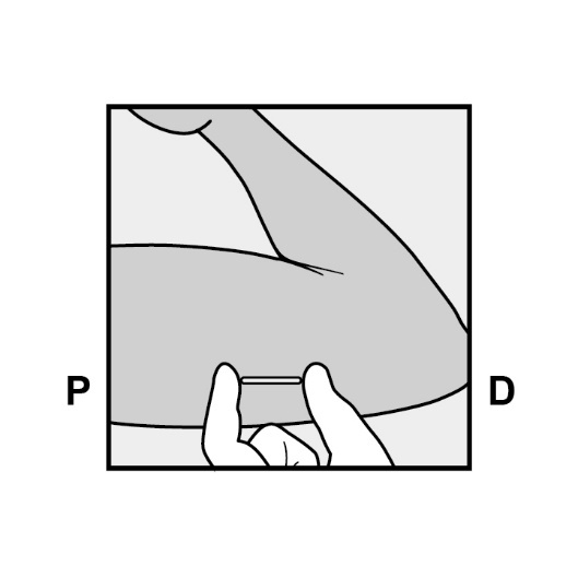 Das Implanon NXT Implantat muss subkutan, DIREKT UNTER DIE HAUT, an der Innenseite des weniger beanspruchten Oberarms eingelegt werden. Die Einlagestelle liegt über dem Trizeps mit einem Abstand von ca. 8 – 10 cm (3 – 4 Inches) vom medialen Epikondylus des Oberarmknochens und 3 – 5 cm (1,25 – 2 Inches) hinter (unter) dem Sulcus (der Furche) zwischen Bizeps und Trizeps. Durch diese Einlagestelle werden die großen Blutgefäße und Nerven umgangen, die in und um den Sulcus liegen (siehe Abbildungen 2a, 2b und 2c).