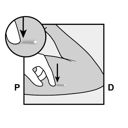Überprüfen Sie immer unmittelbar nach Einlage durch Ertasten, ob sich das Implantat im Arm der Anwenderin befindet. Durch Ertasten der beiden Enden des Implantats sollte es möglich sein, zu bestätigen, dass das 4 cm lange Stäbchen vorhanden ist (Abbildung 9). Siehe nachfolgenden Abschnitt „Wenn das Implantat nach Einlage nicht ertastet werden kann“.