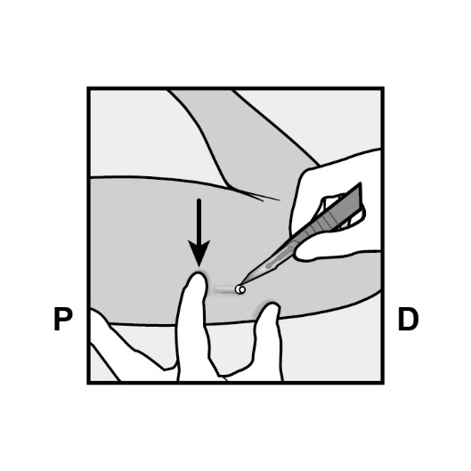 Setzen Sie zwei Markierungen mit einem chirurgischen Marker: Markieren Sie zuerst den Punkt, an dem das Implantat eingelegt wird, und setzen Sie dann, 5 Zentimeter (2 Inches) proximal (in Richtung Schulter) von der ersten Markierung, eine zweite Markierung (Abbildungen 2a und 2b). Diese zweite Markierung (Leitmarkierung) dient später als Orientierungshilfe beim Einlegen.