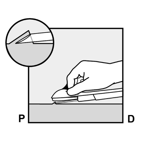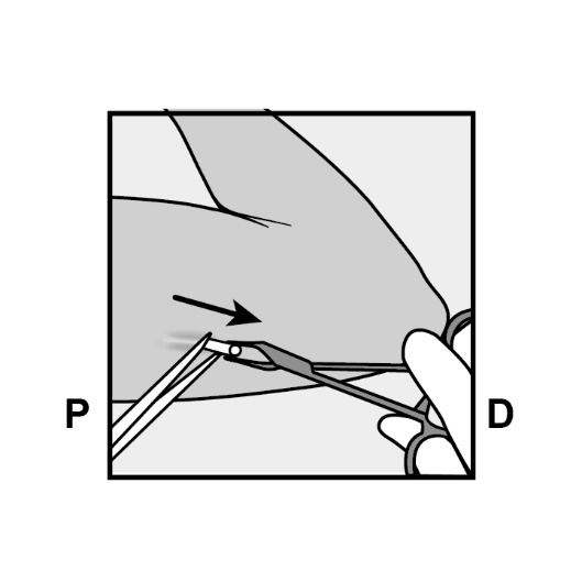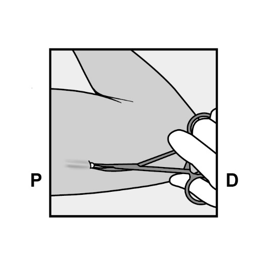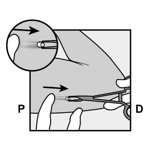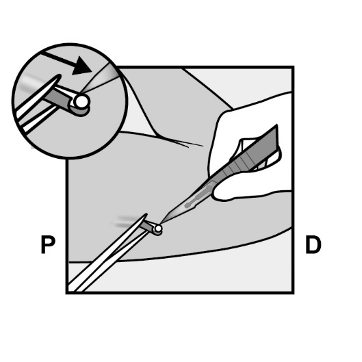 Steht das Implantat aus der Einlagestelle heraus, entfernen Sie das Implantat und wiederholen Sie das Verfahren an derselben Einlagestelle mit einem neuen Applikator. Schieben Sie das herausstehende Implantat nicht zurück in die Inzision.