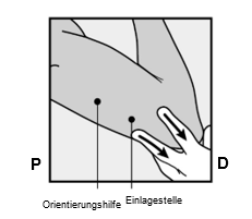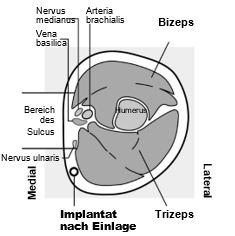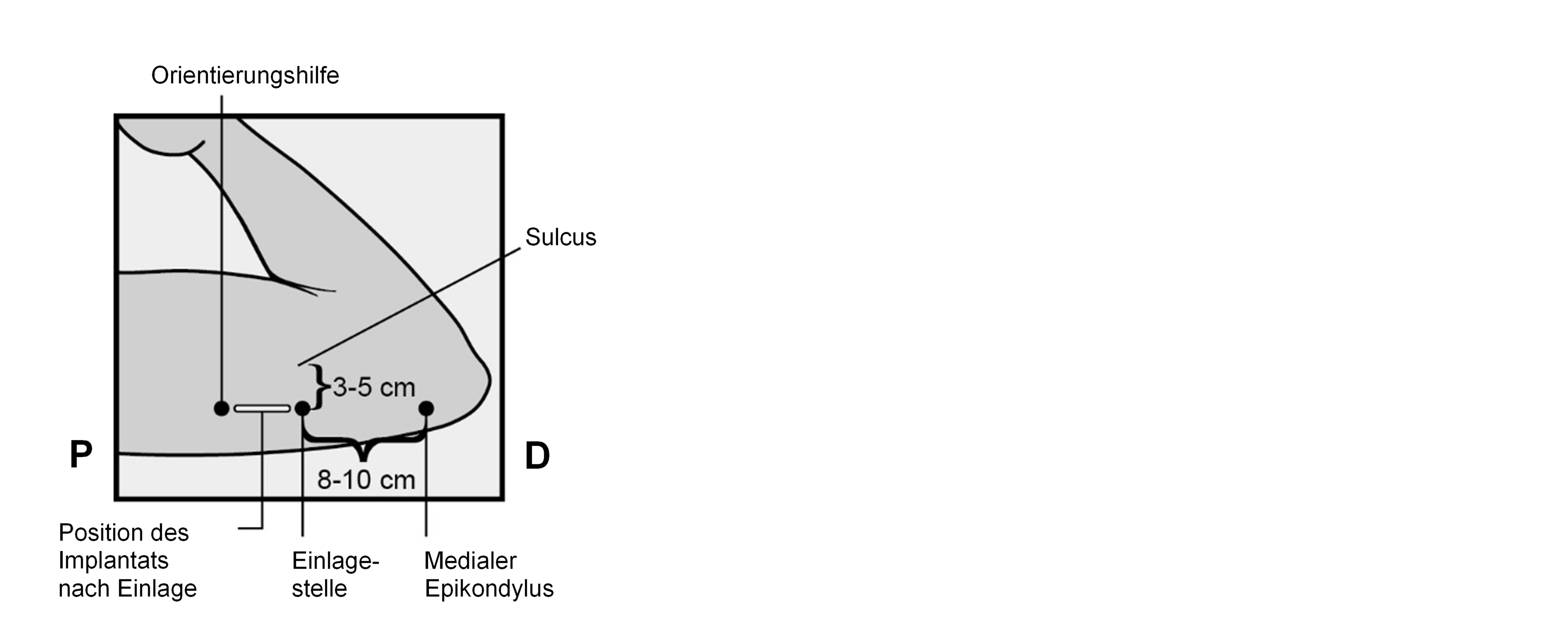 Das Implantat muss subkutan direkt unter die Haut an der Innenseite des weniger beanspruchten Oberarms eingelegt werden.
