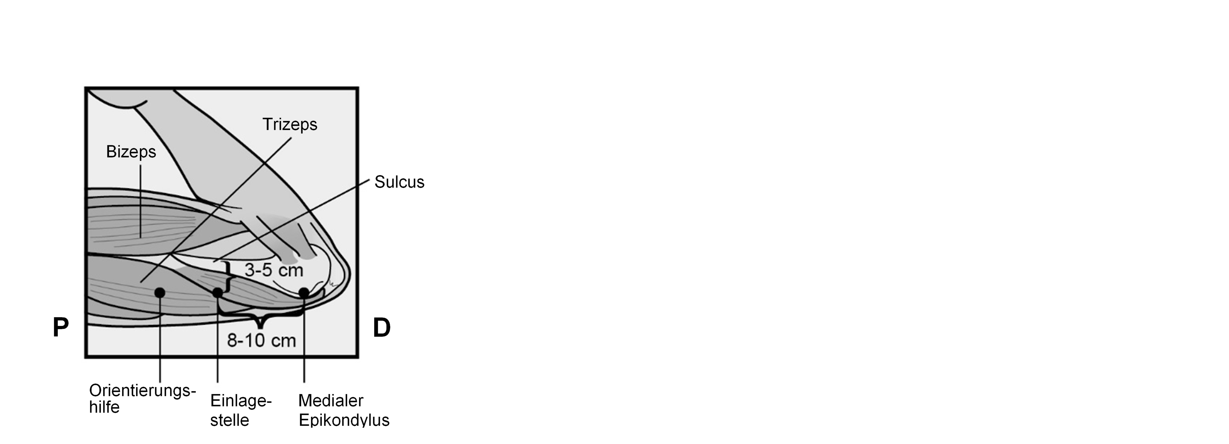 Bestimmen Sie die Einlagestelle an der Innenseite des weniger beanspruchten Oberarms. Die Einlagestelle liegt über dem Trizeps mit einem Abstand von ca. 8 – 10 cm (3 – 4 Inches) vom medialen Epikondylus des Oberarmknochens und 3 – 5 cm (1,25 – 2 Inches) hinter (unter) dem Sulcus (der Furche) zwischen Bizeps und Trizeps (Abbildungen 2a, 2b und 2c). Durch diese Einlagestelle werden die großen Blutgefäße und Nerven umgangen, die in und um den Sulcus liegen. Falls es nicht möglich ist, das Implantat an dieser Stelle einzulegen (z. B. bei Frauen mit dünnen Armen), muss es so weit wie möglich hinter dem Sulcus eingelegt werden.