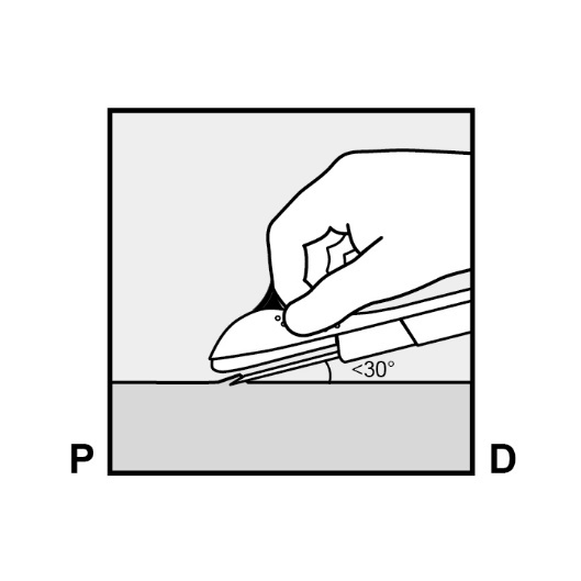 Führen Sie die Nadel ein, bis sich die abgeschrägte Kante (abgeschrägte Öffnung der Spitze) direkt unter der Haut befindet (jedoch nicht weiter) (Abbildung 5b). Sollten Sie die Nadel tiefer als bis zur abgeschrägten Kante eingeführt haben, ziehen Sie die Nadel so weit zurück, bis nur noch die abgeschrägte Kante unter der Haut ist.