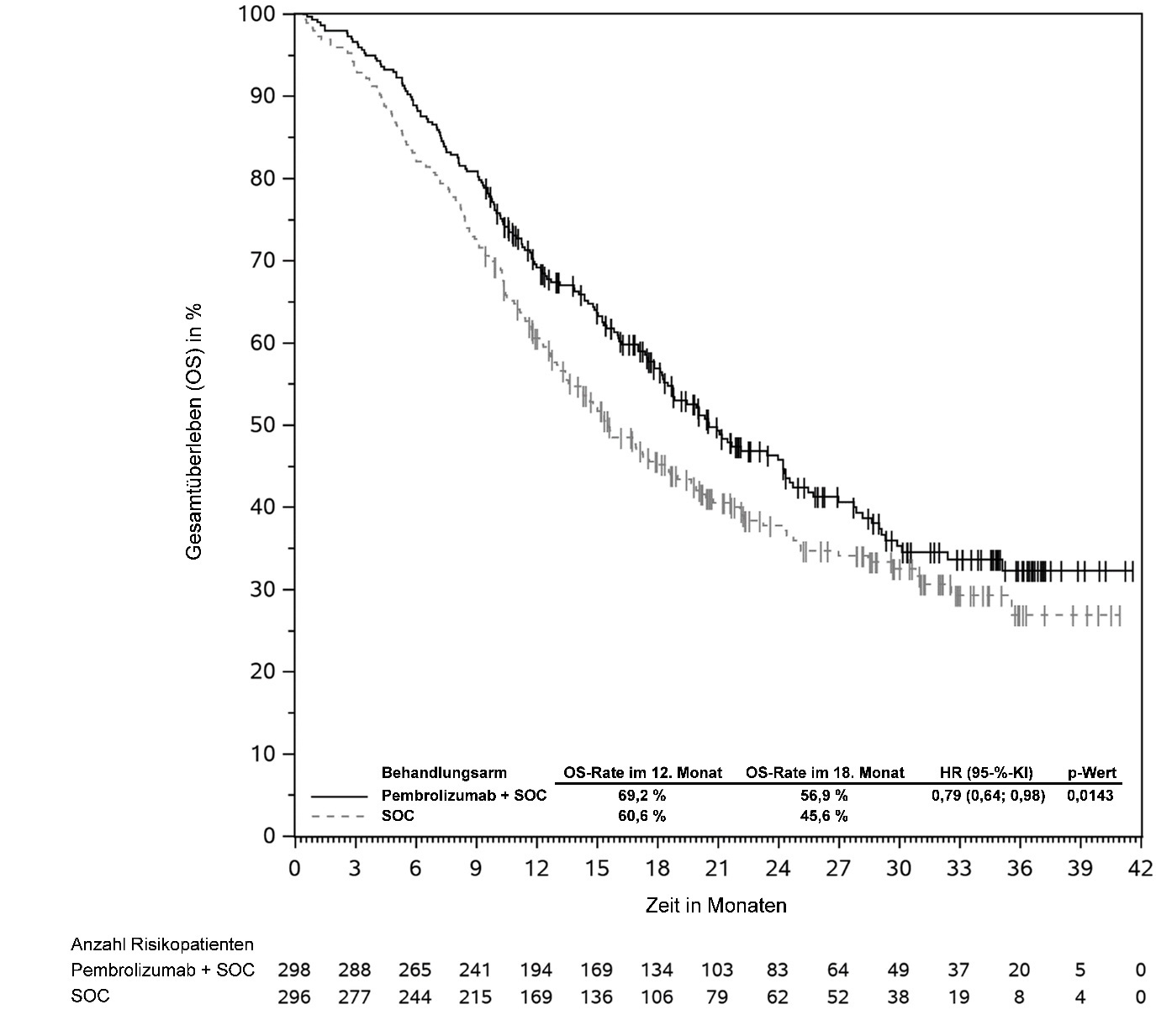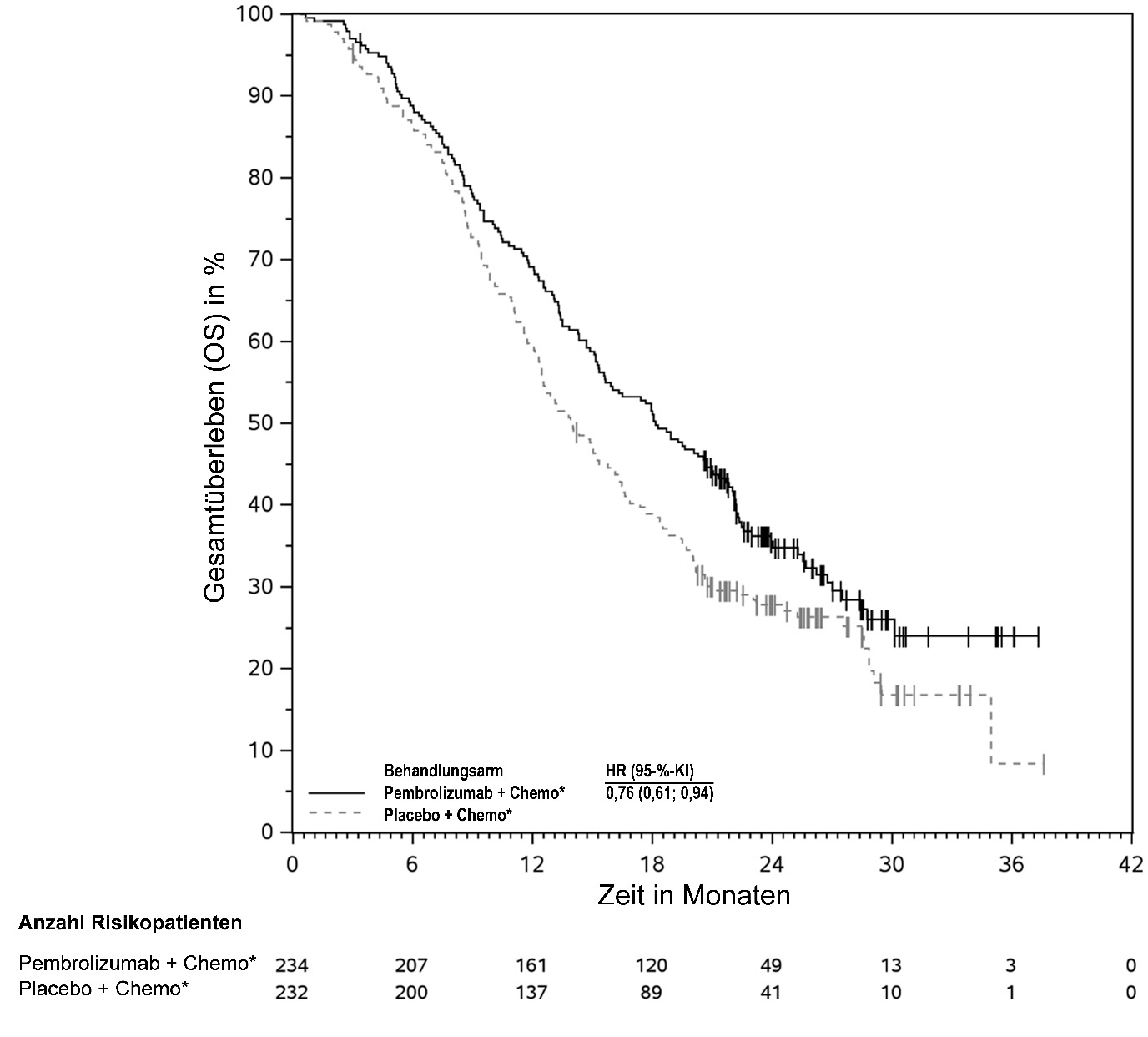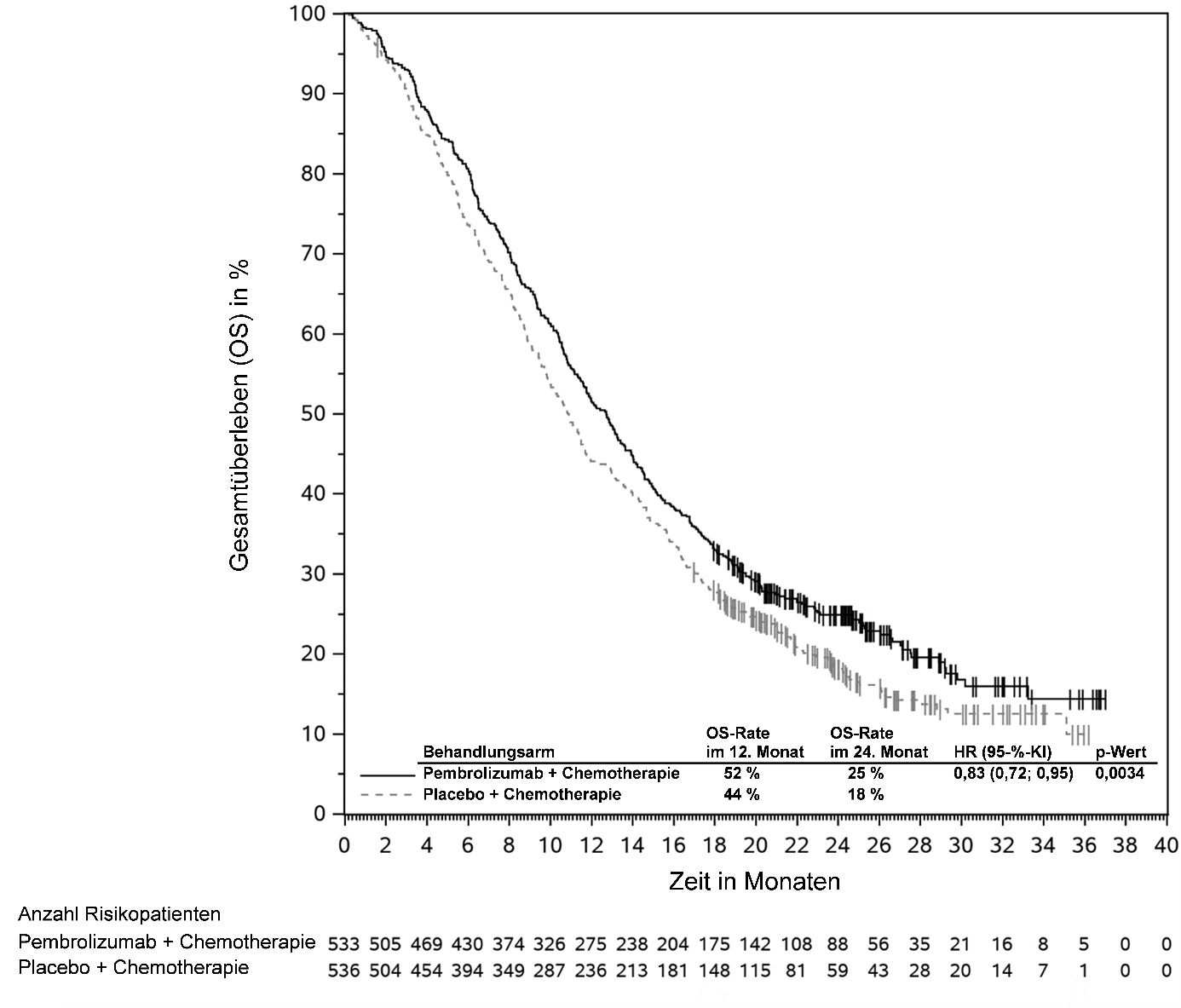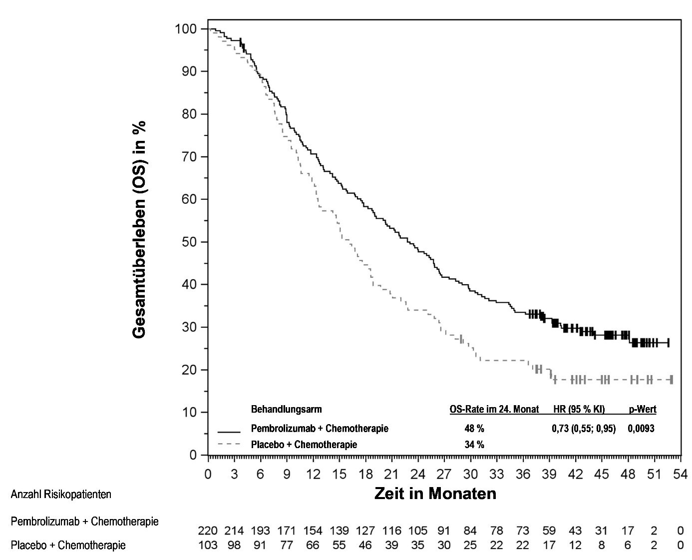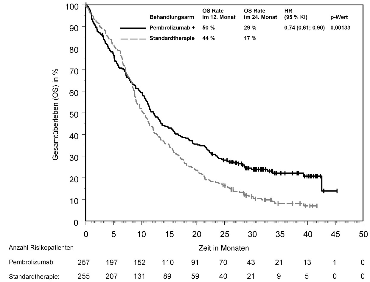 Abbildung 58: Kaplan-Meier-Kurve des Gesamtüberlebens (OS) nach Behandlungsarm in KEYNOTE‑966 (Intent-to-Treat-Population)