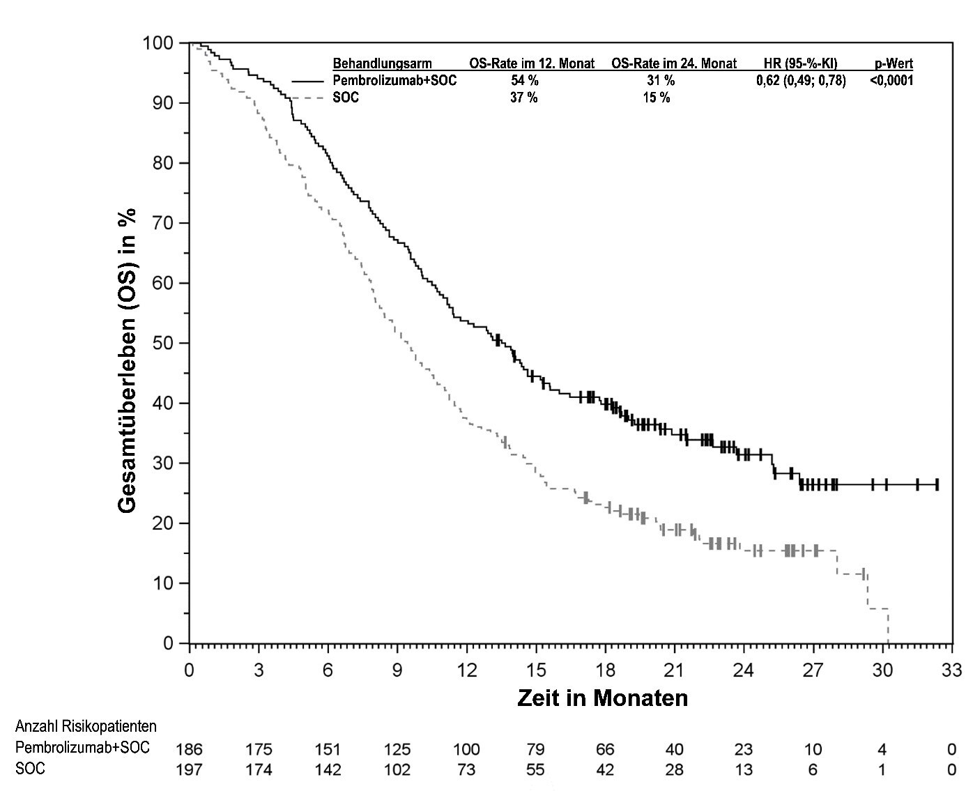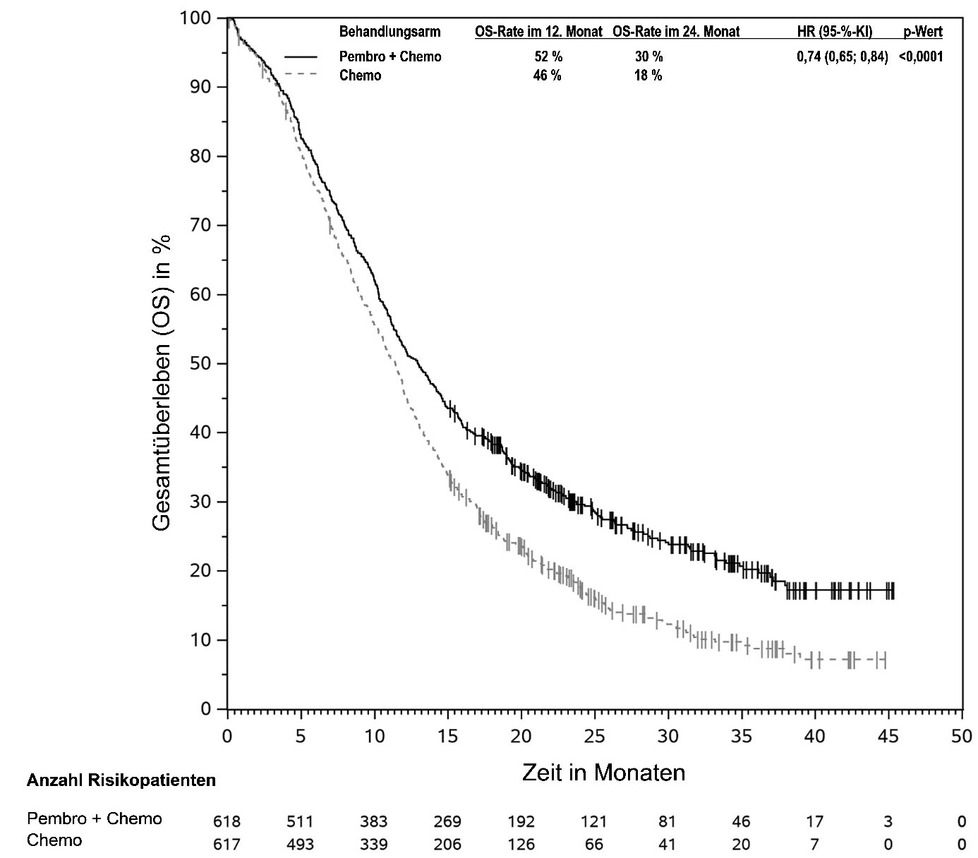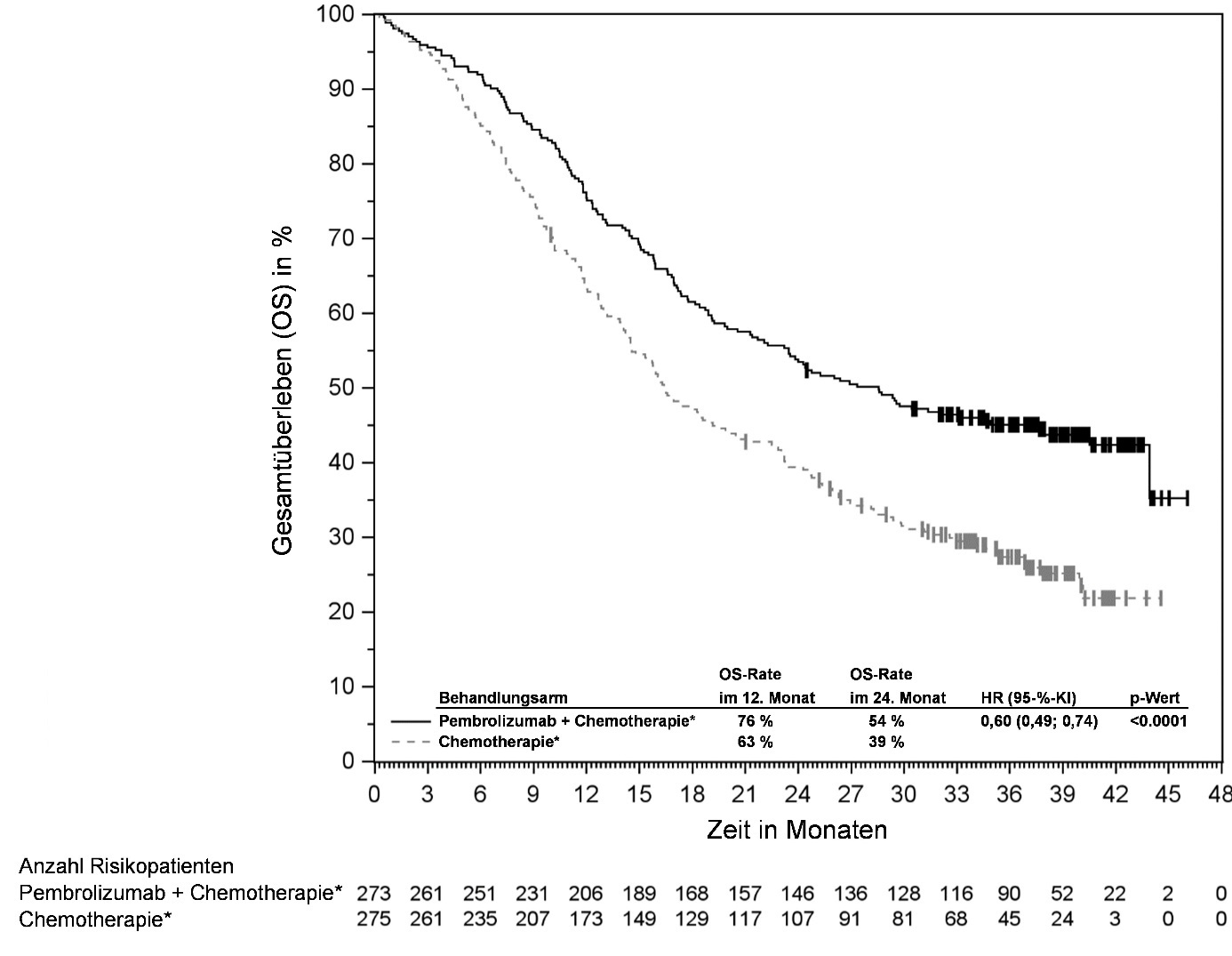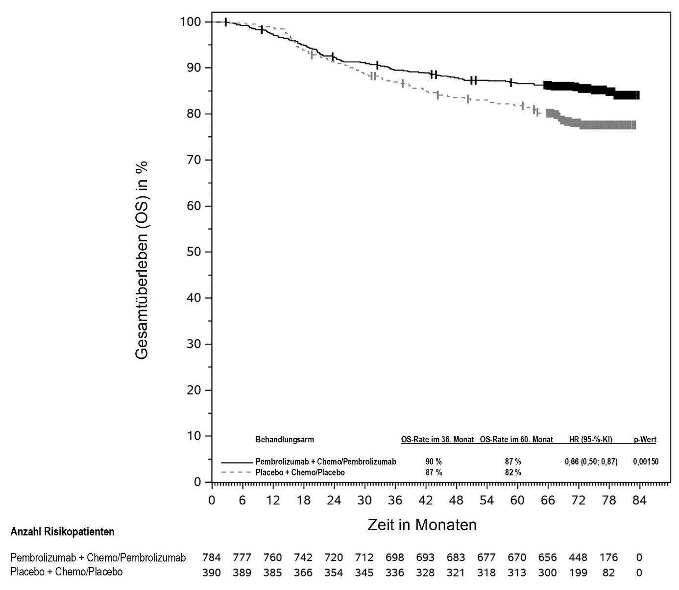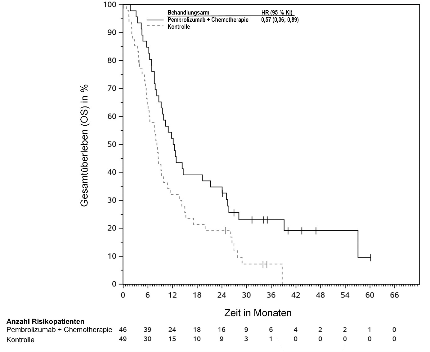 Abbildung 58: Kaplan-Meier-Kurve des Gesamtüberlebens (OS) nach Behandlungsarm in KEYNOTE‑966 (Intent-to-Treat-Population)