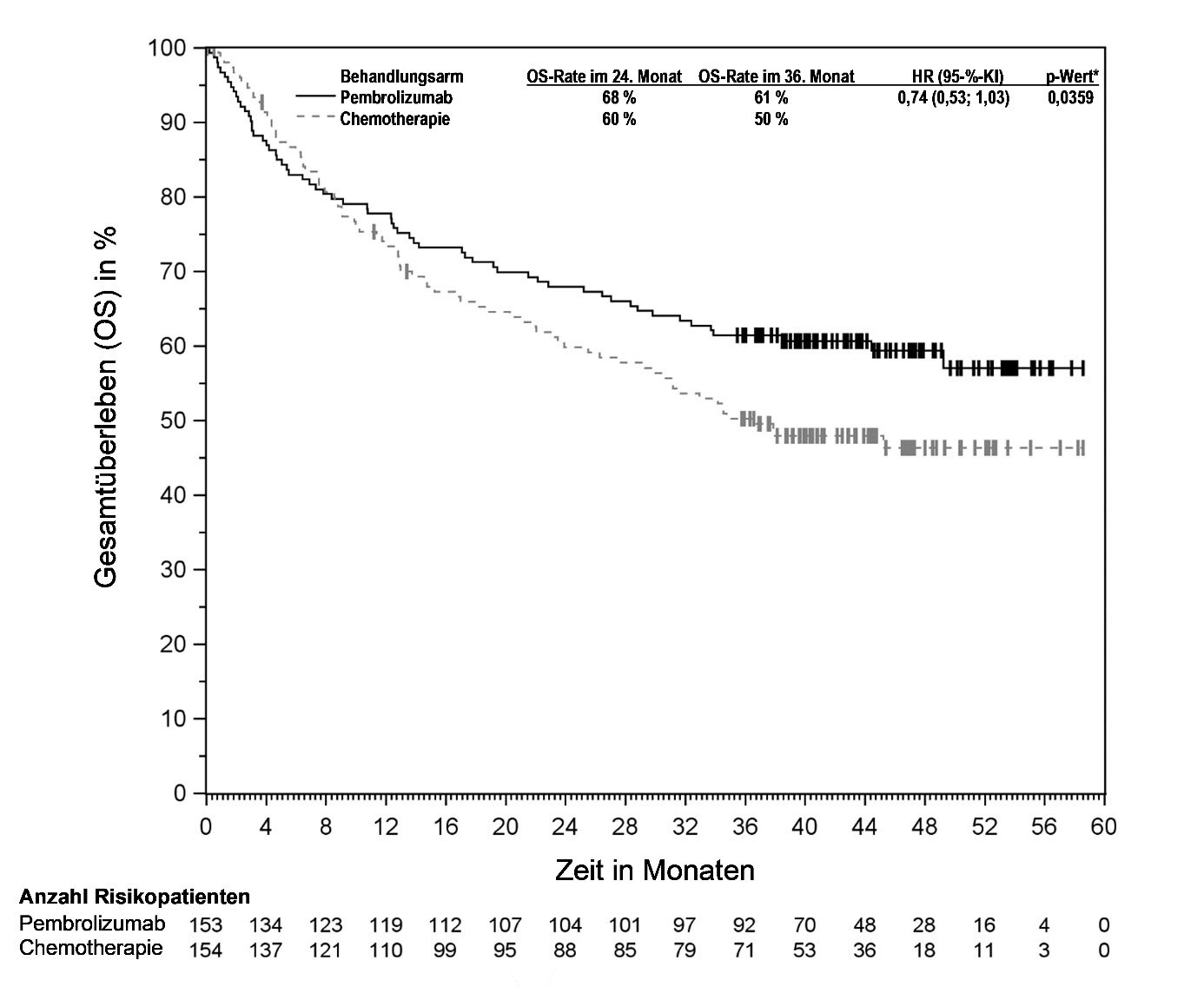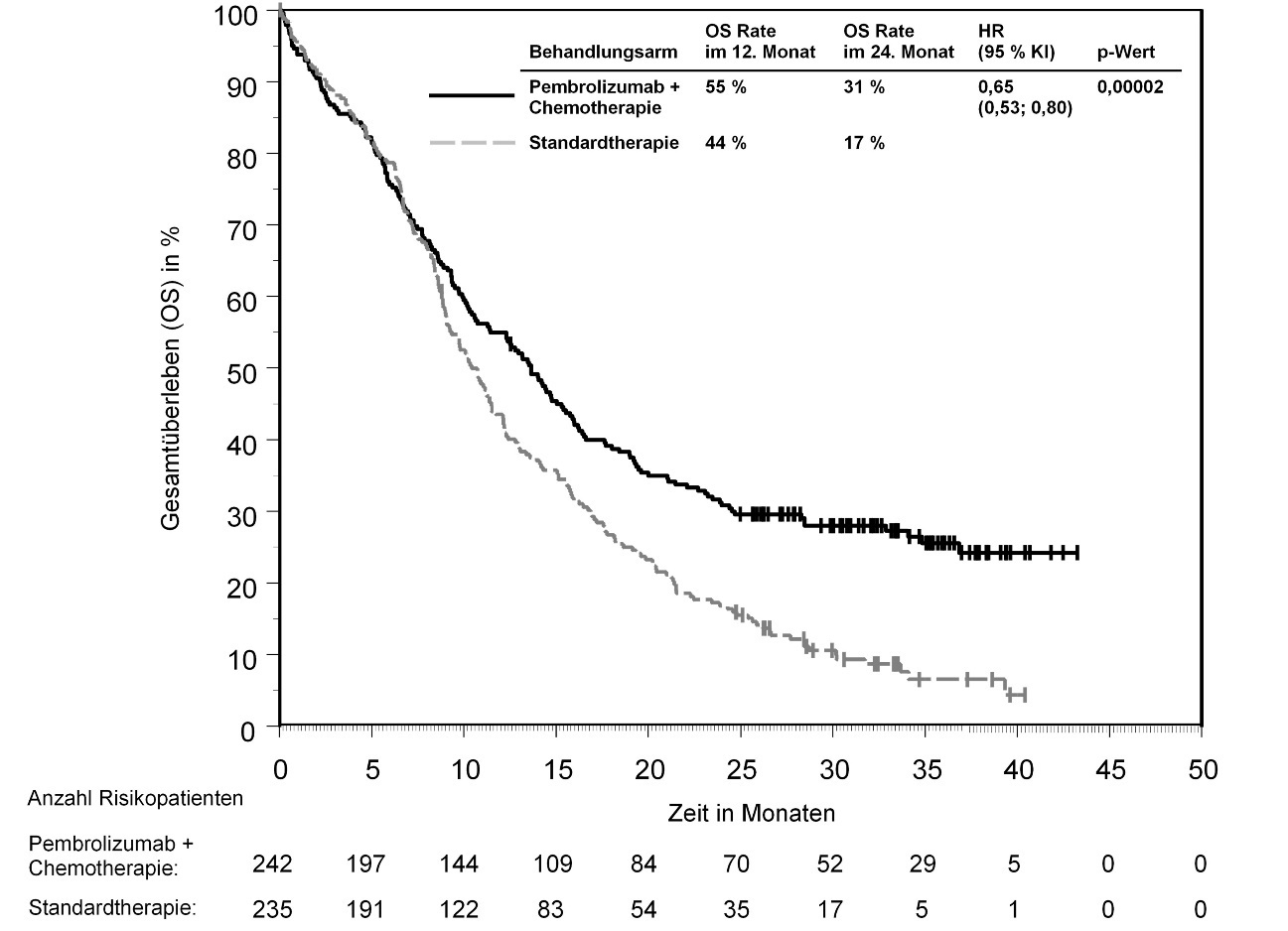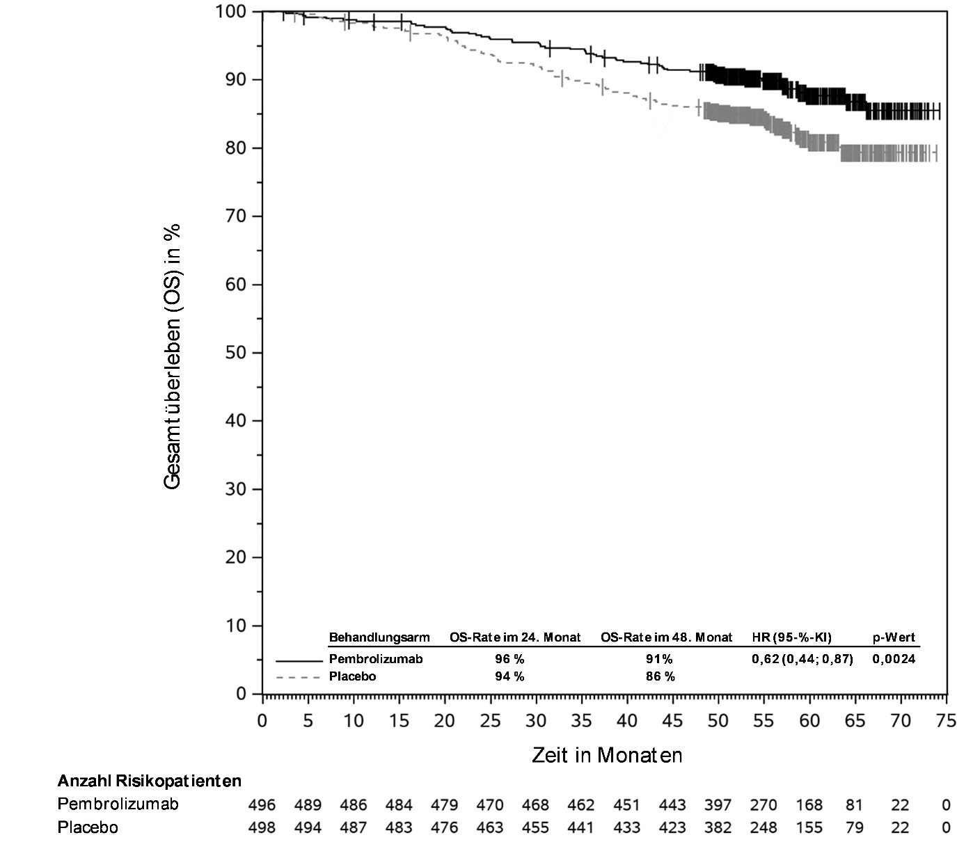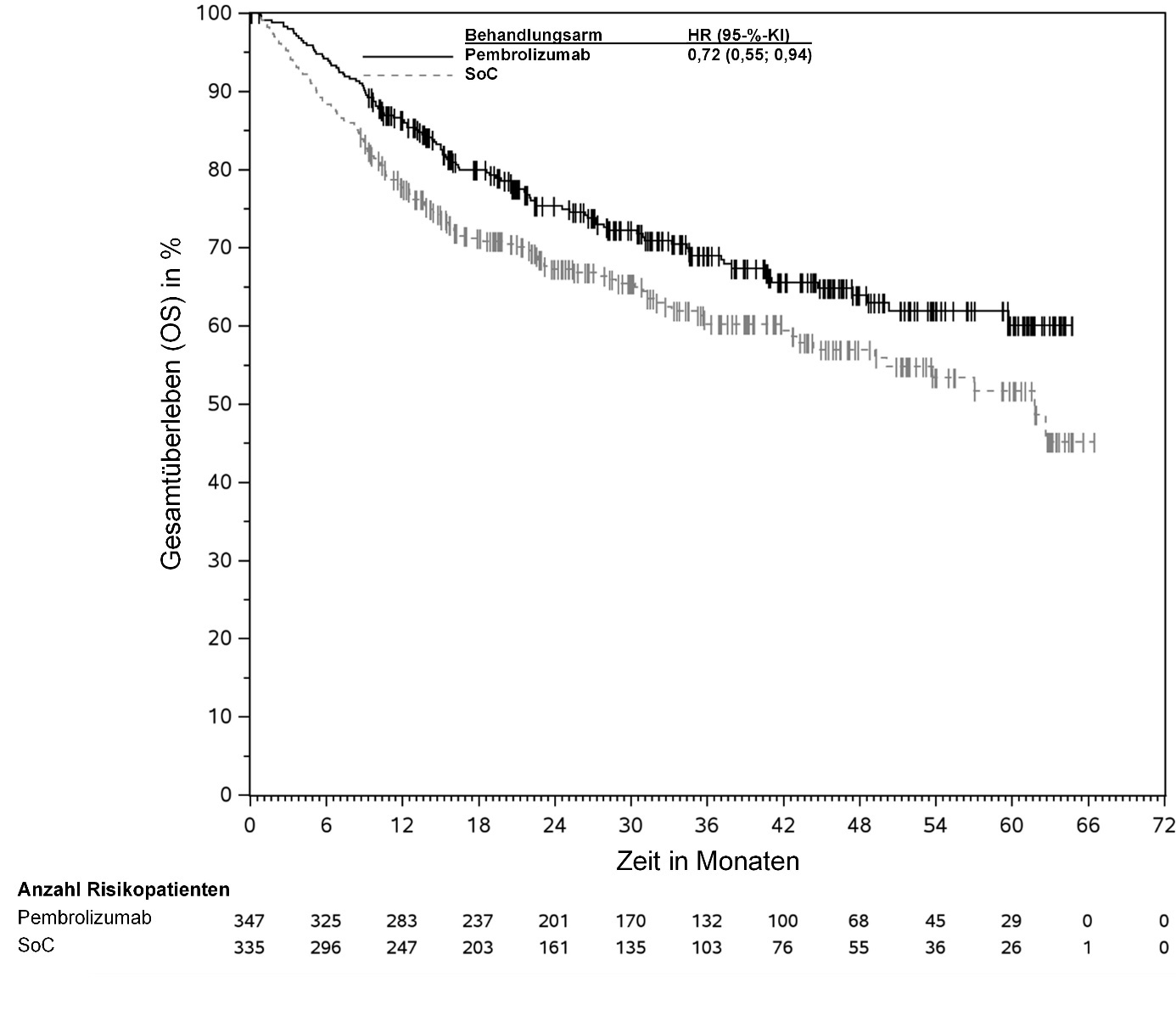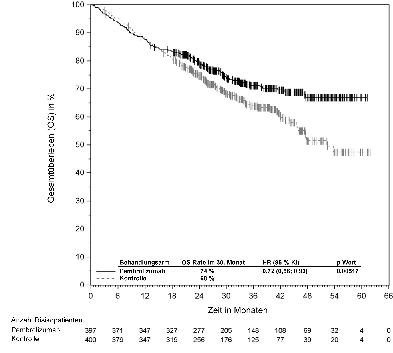 Abbildung 58: Kaplan-Meier-Kurve des Gesamtüberlebens (OS) nach Behandlungsarm in KEYNOTE‑966 (Intent-to-Treat-Population)