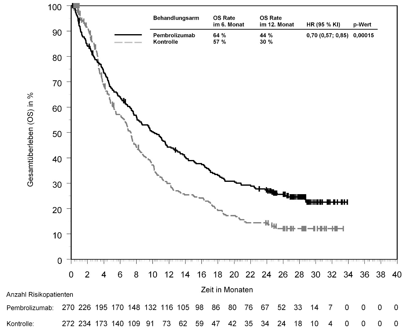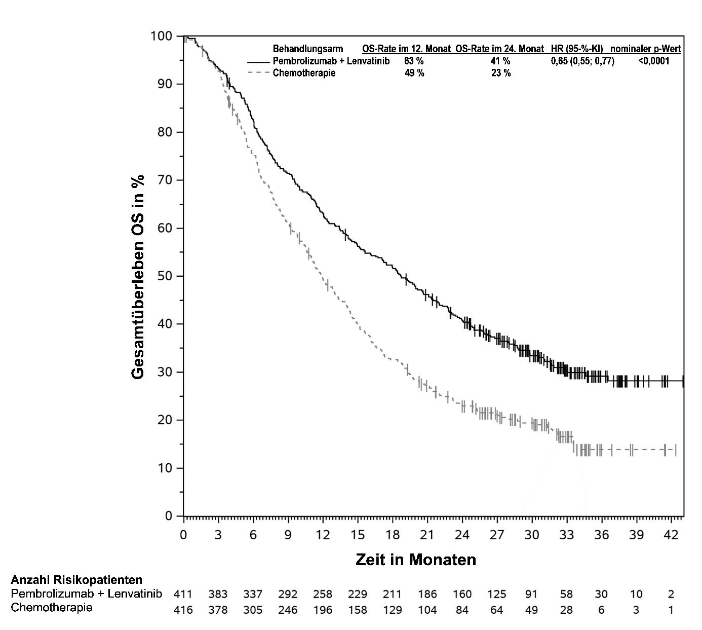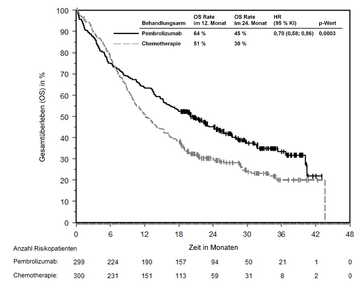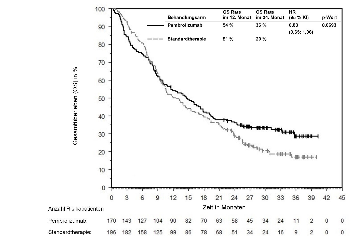 Abbildung 58: Kaplan-Meier-Kurve des Gesamtüberlebens (OS) nach Behandlungsarm in KEYNOTE‑966 (Intent-to-Treat-Population)