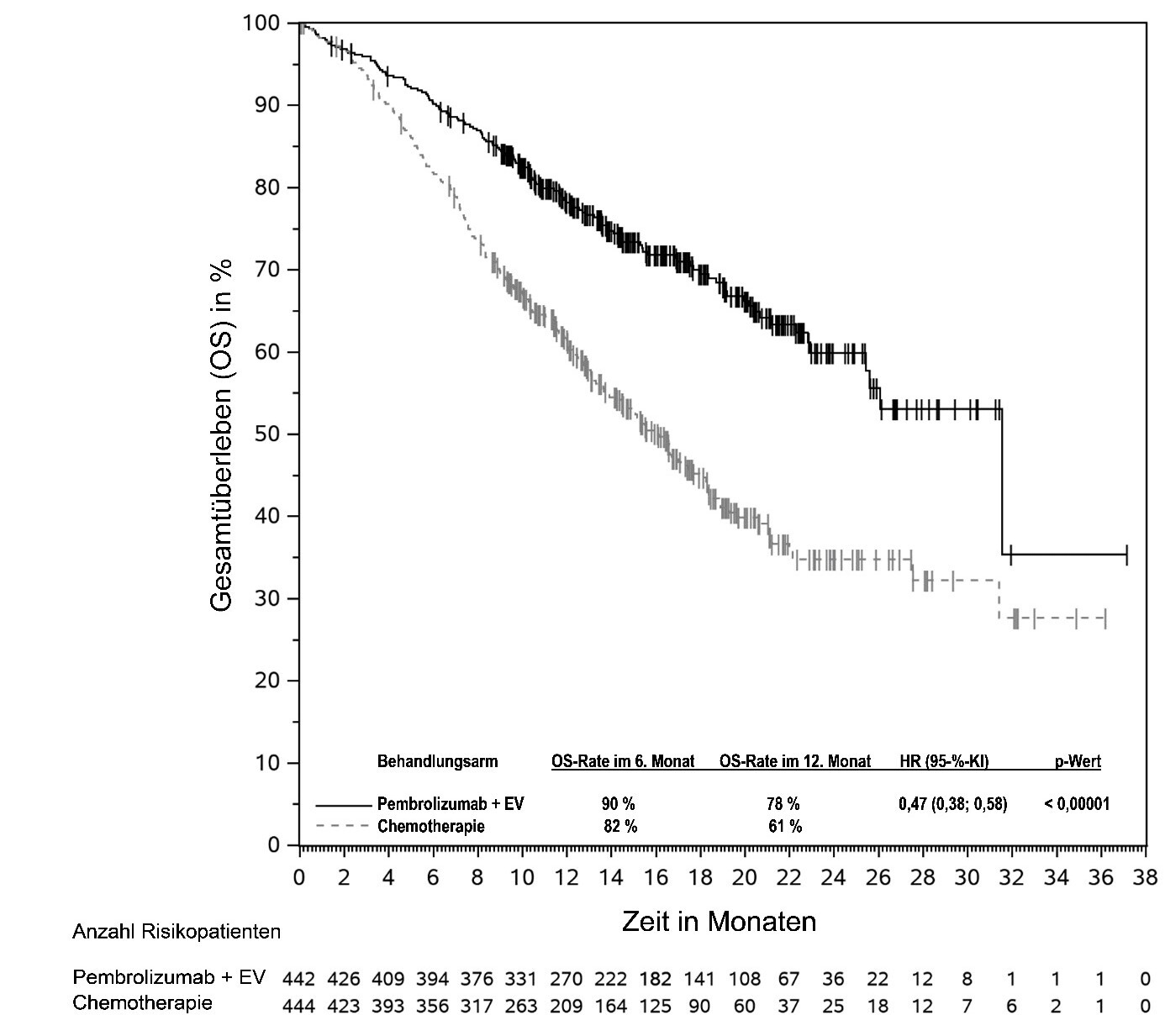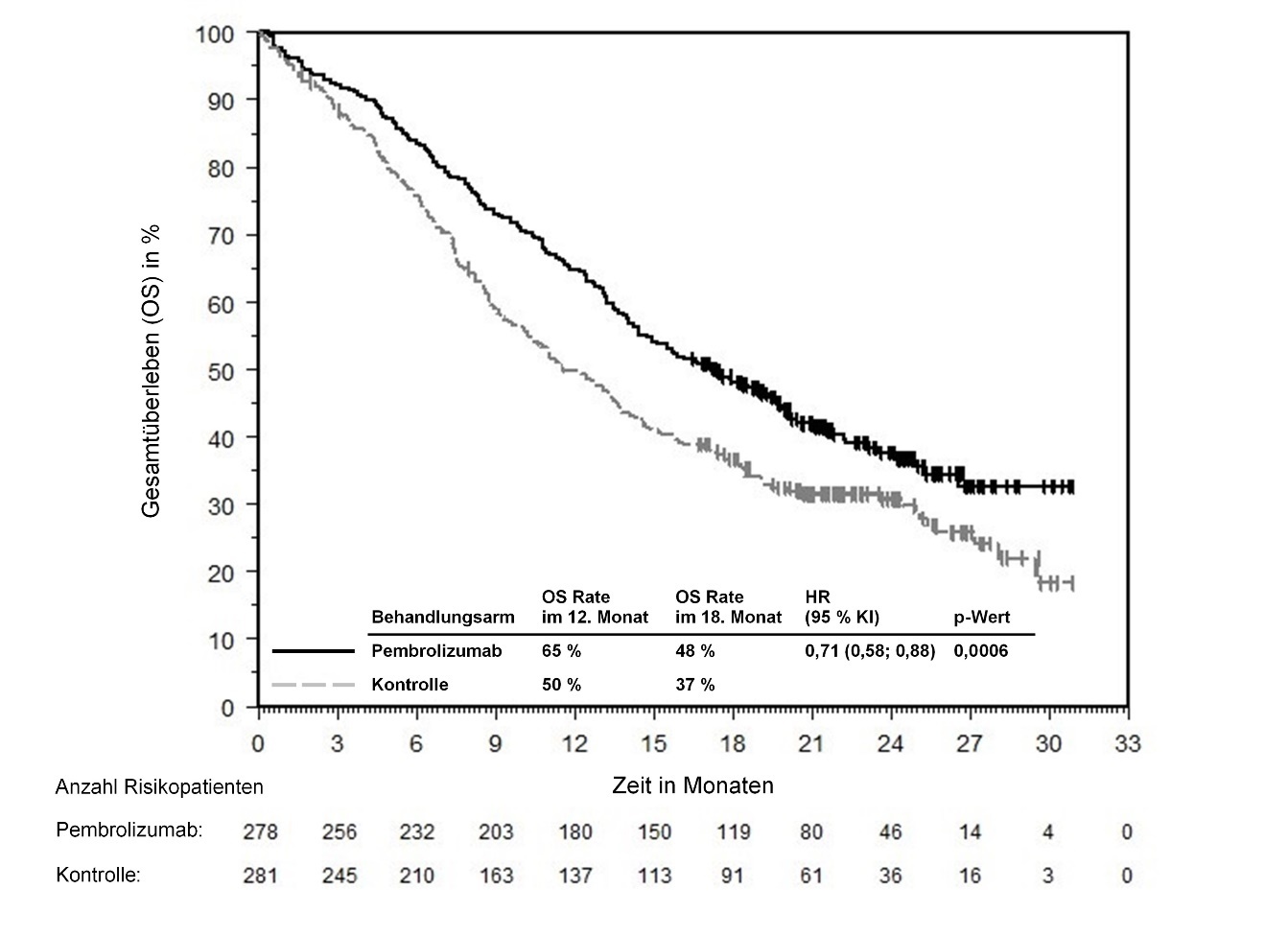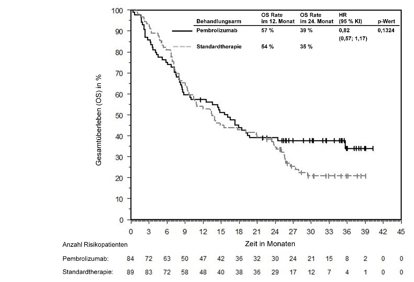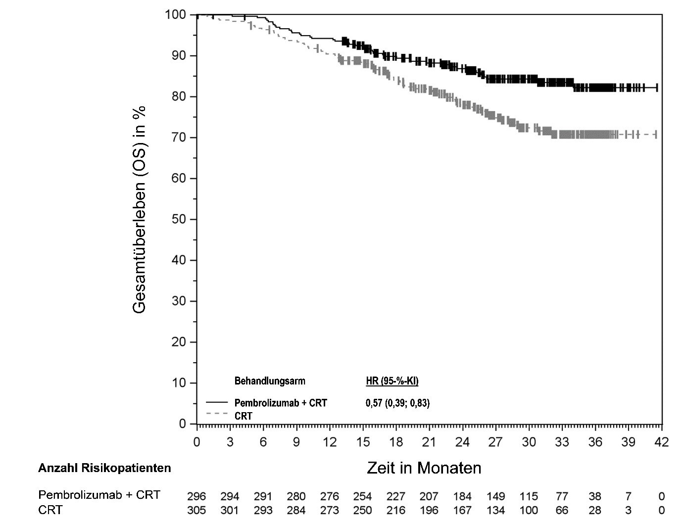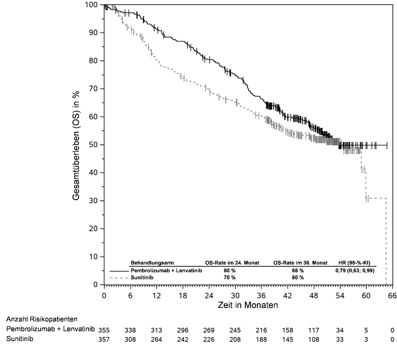Abbildung 58: Kaplan-Meier-Kurve des Gesamtüberlebens (OS) nach Behandlungsarm in KEYNOTE‑966 (Intent-to-Treat-Population)