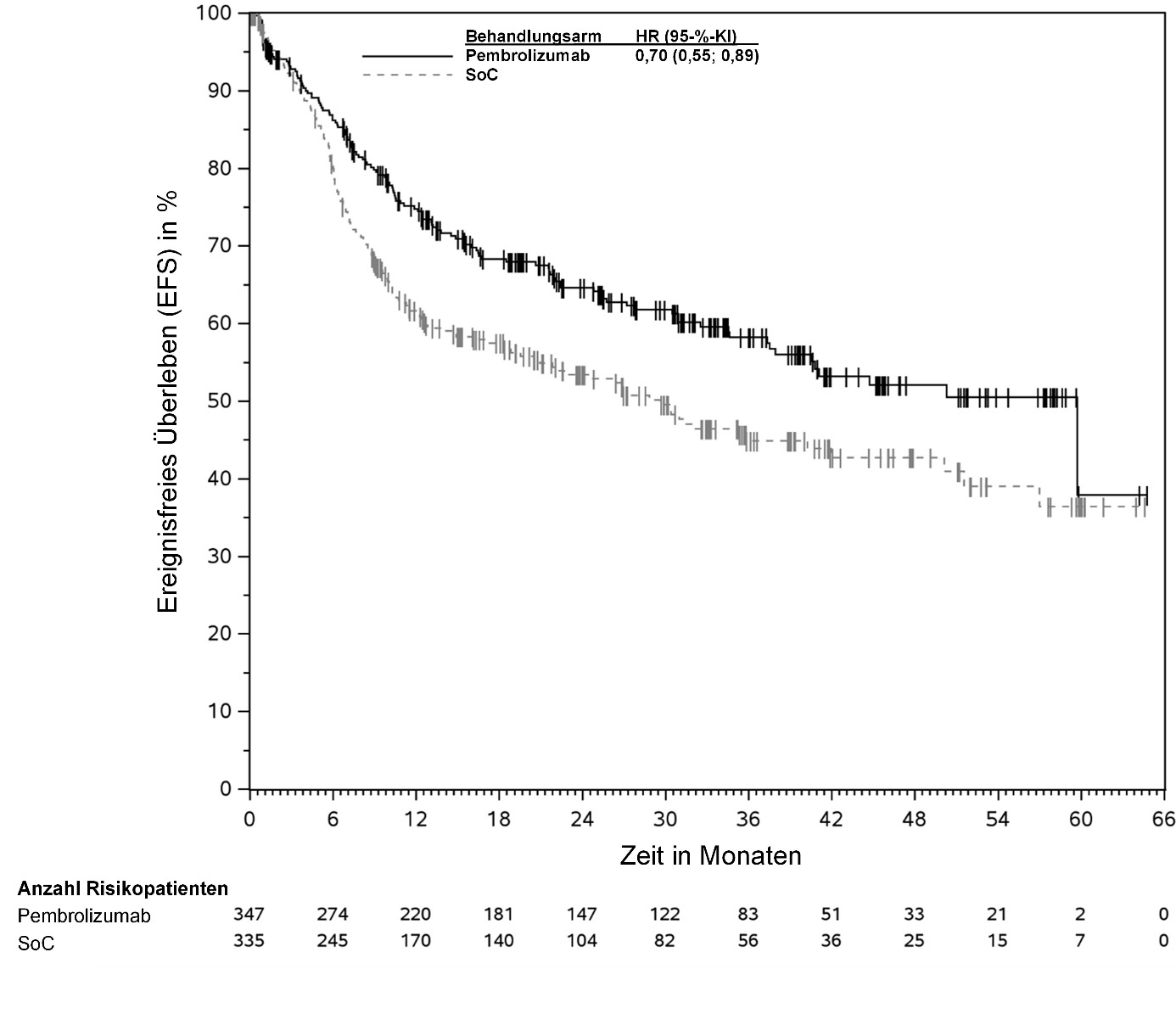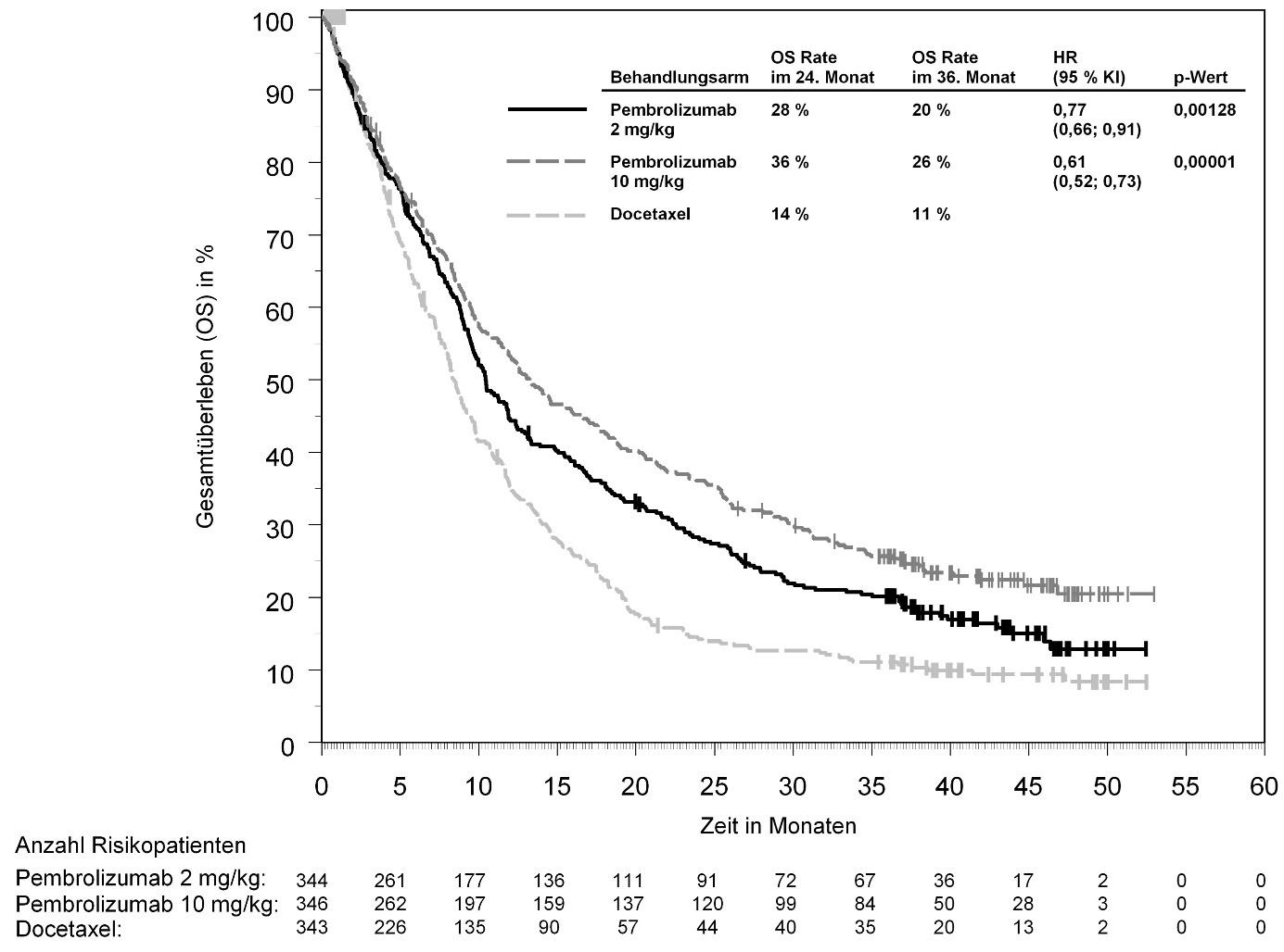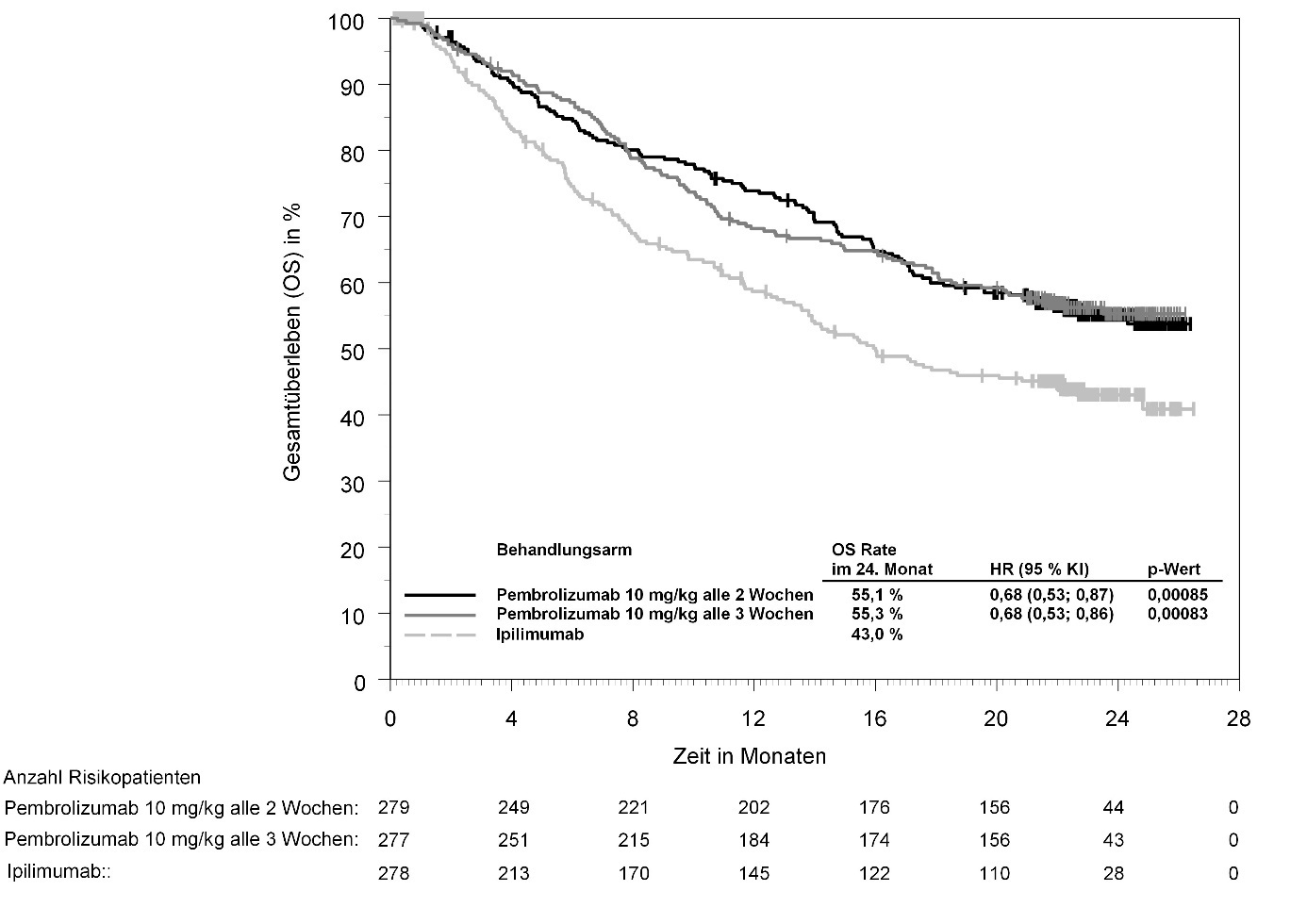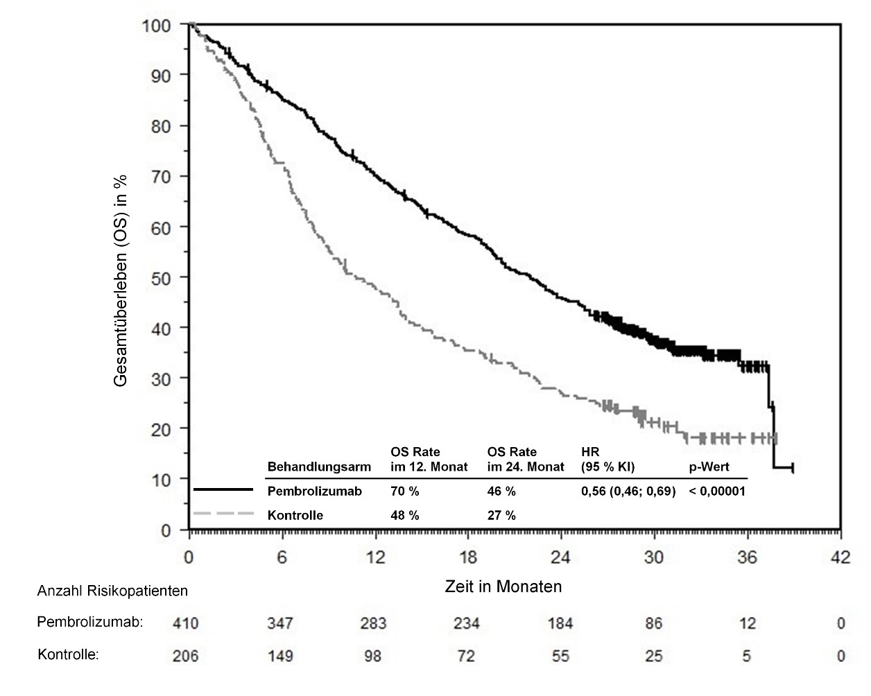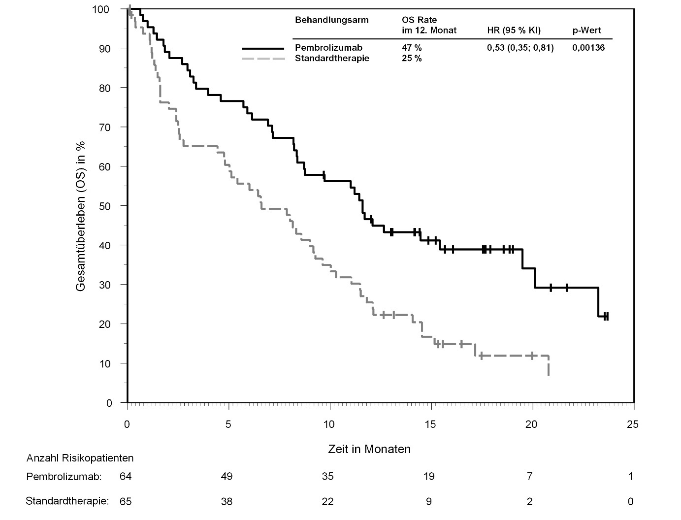 Abbildung 58: Kaplan-Meier-Kurve des Gesamtüberlebens (OS) nach Behandlungsarm in KEYNOTE‑966 (Intent-to-Treat-Population)