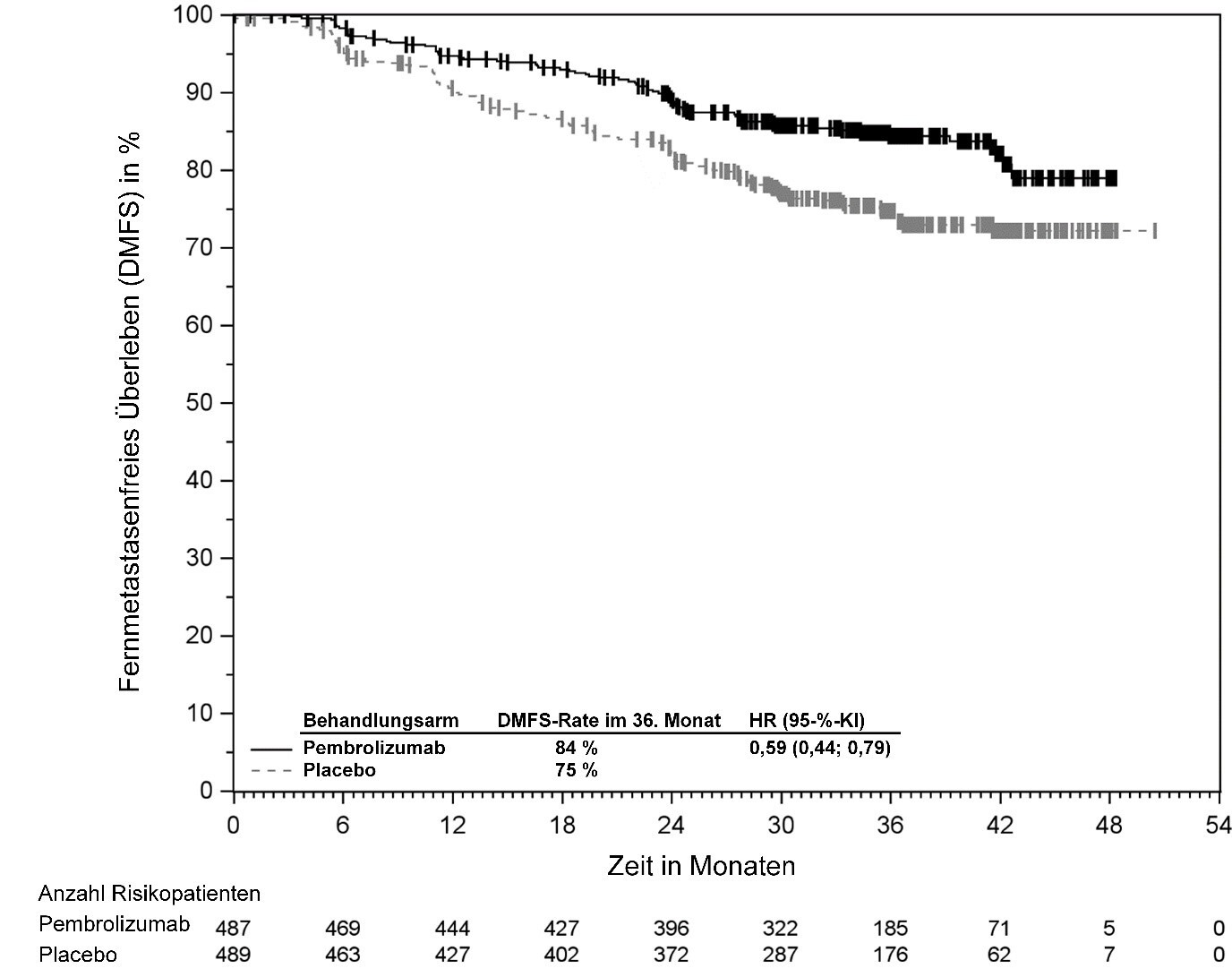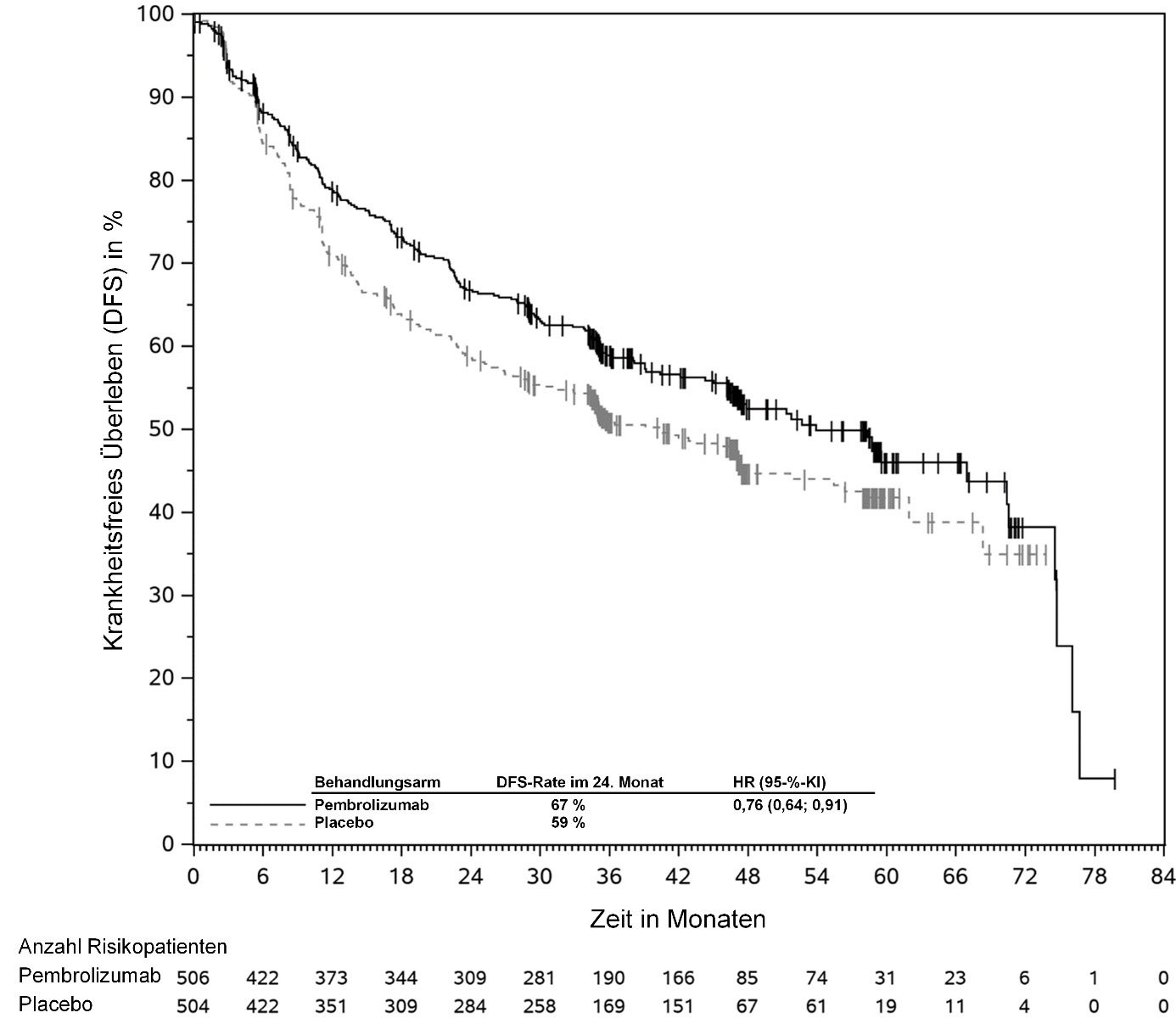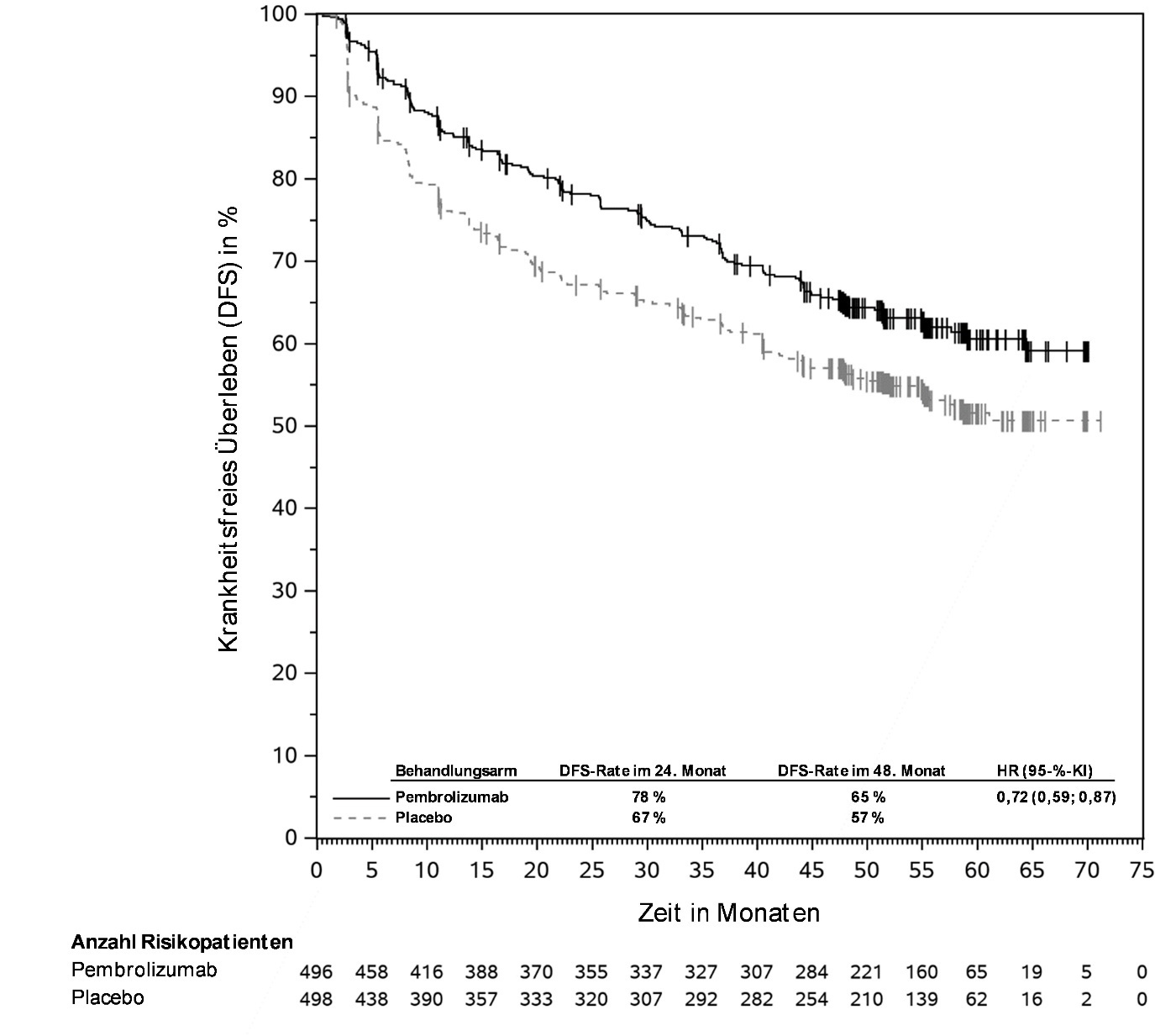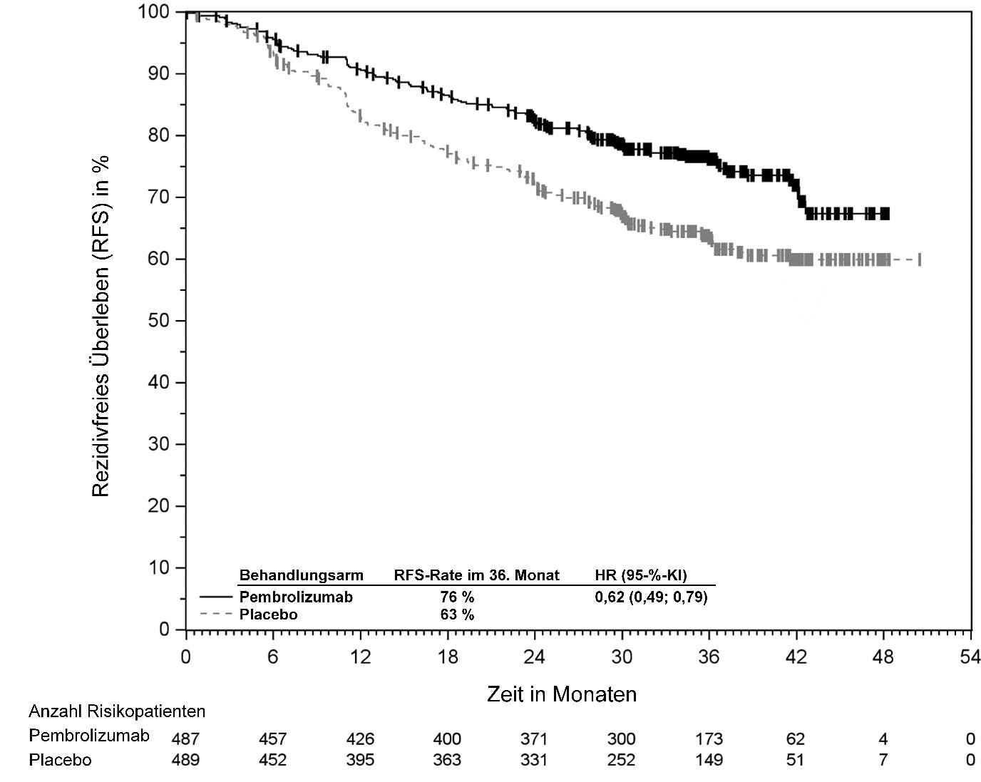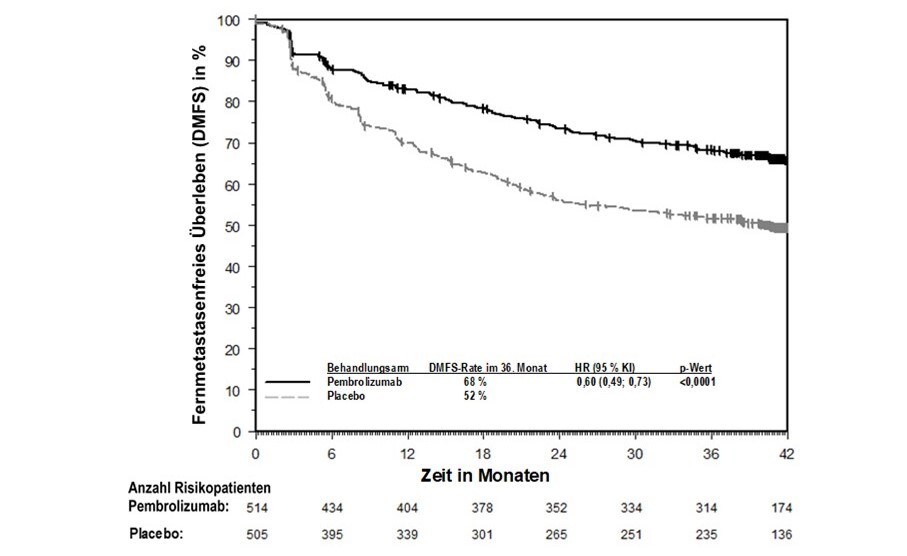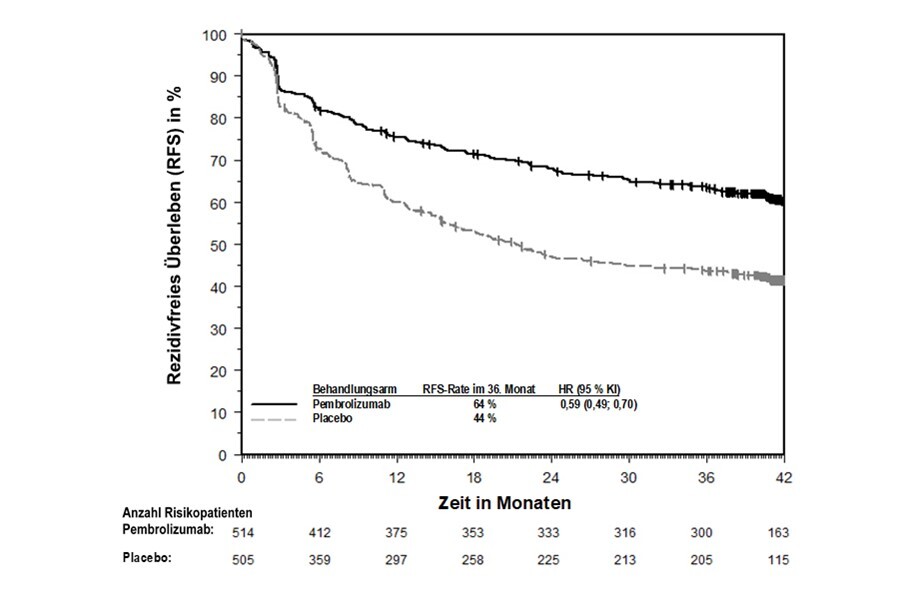 KEYTRUDA ist als Monotherapie zur adjuvanten Behandlung des nicht-kleinzelligen Lungenkarzinoms mit hohem Rezidivrisiko nach vollständiger Resektion und Platin-basierter Chemotherapie bei Erwachsenen angezeigt (hinsichtlich Selektionskriterien siehe Abschnitt 5.1).