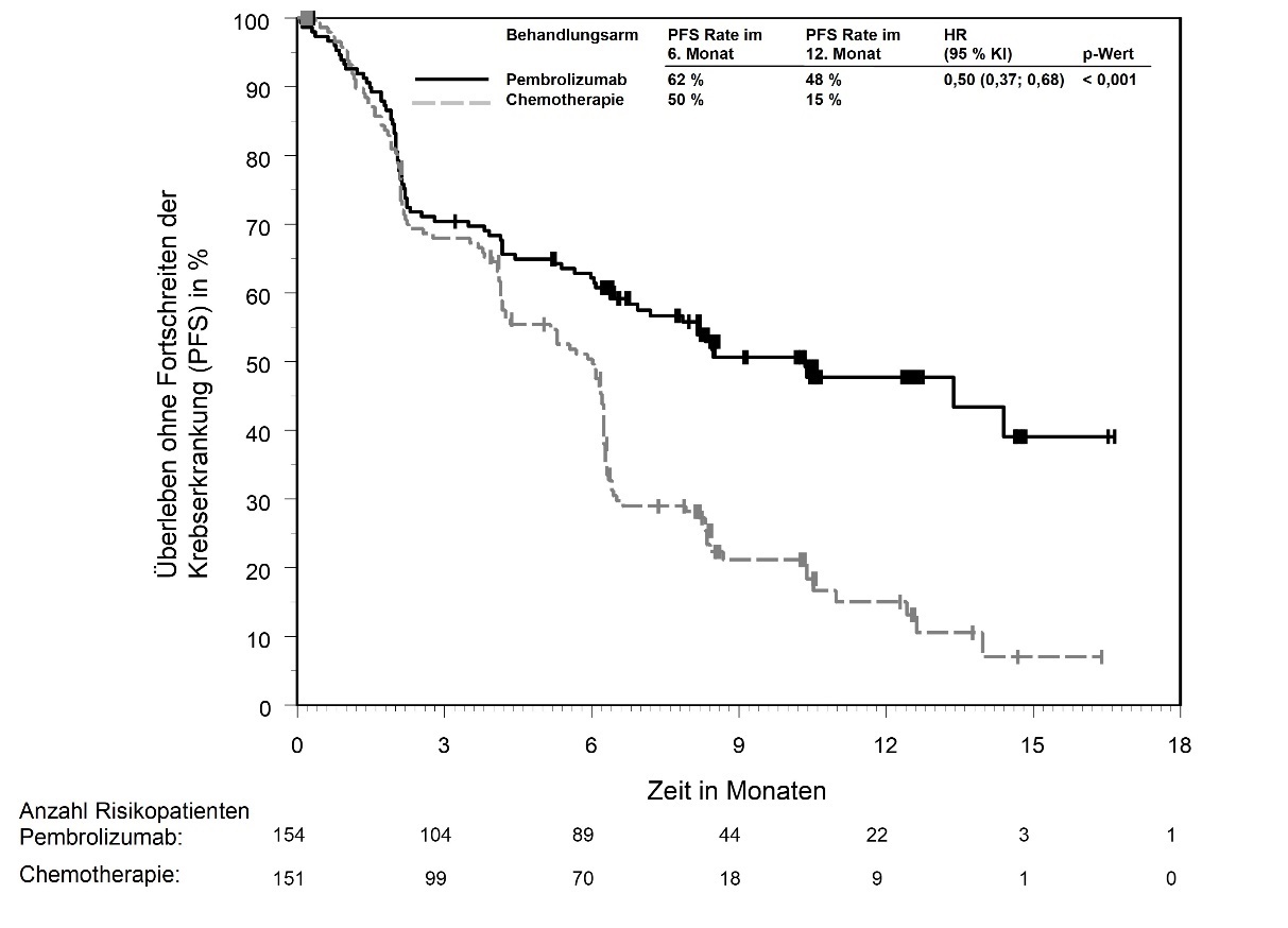 KEYTRUDA ist als Monotherapie zur Behandlung des rezidivierenden oder metastasierenden Plattenepithelkarzinoms der Kopf-Hals-Region mit PD‑L1-exprimierenden Tumoren (TPS ≥ 50 %) und einem Fortschreiten der Krebserkrankung während oder nach vorheriger Platin-basierter Therapie bei Erwachsenen angezeigt (siehe Abschnitt 5.1).