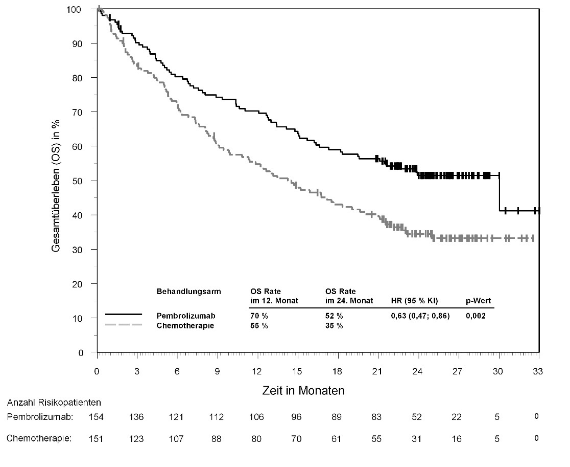 Der primäre Wirksamkeitsendpunkt war das Überleben ohne Fortschreiten der Krebserkrankung (PFS), das gemäß RECIST‑v1.1-Kriterien vom Prüfarzt bewertet wurde. Der sekundäre Wirksamkeitsendpunkt war das Gesamtüberleben (OS). In der ersten präspezifizierten Interimsanalyse zeigte die Studie eine statistisch signifikante Verbesserung hinsichtlich PFS für die Patienten, die zu Pembrolizumab in Kombination mit Paclitaxel mit oder ohne Bevacizumab randomisiert wurden, im Vergleich zu Placebo in Kombination mit Paclitaxel mit oder ohne Bevacizumab, in der Gesamtpopulation (HR = 0,70 [95-%-KI: 0,58; 0,84; p‑Wert < 0,0001]; mediane Nachbeobachtungszeit von 11,8 Monaten [Spanne: 0,1 bis 27,0 Monate]) und bei den Patienten, deren Tumoren PD‑L1 mit einem CPS ≥ 1 exprimierten. Die Studie zeigte eine statistisch signifikante Verbesserung hinsichtlich OS für Patienten, die zu Pembrolizumab in Kombination mit Chemotherapie mit oder ohne Bevacizumab randomisiert wurden, im Vergleich zu Placebo in Kombination mit Chemotherapie mit oder ohne Bevacizumab, deren Tumoren PD‑L1 mit einem CPS ≥ 1 exprimierten, zum Zeitpunkt der zweiten präspezifizierten Interimsanalyse und in der Gesamtpopulation (HR = 0,82 [95-%-KI: 0,69; 0,97; p‑Wert 0,0115]) zum Zeitpunkt der finalen Analyse mit einer medianen Nachbeobachtungszeit von 15,6 Monaten (Spanne: 0,1 bis 44,1 Monate).
