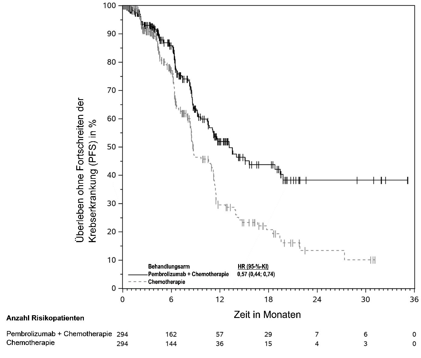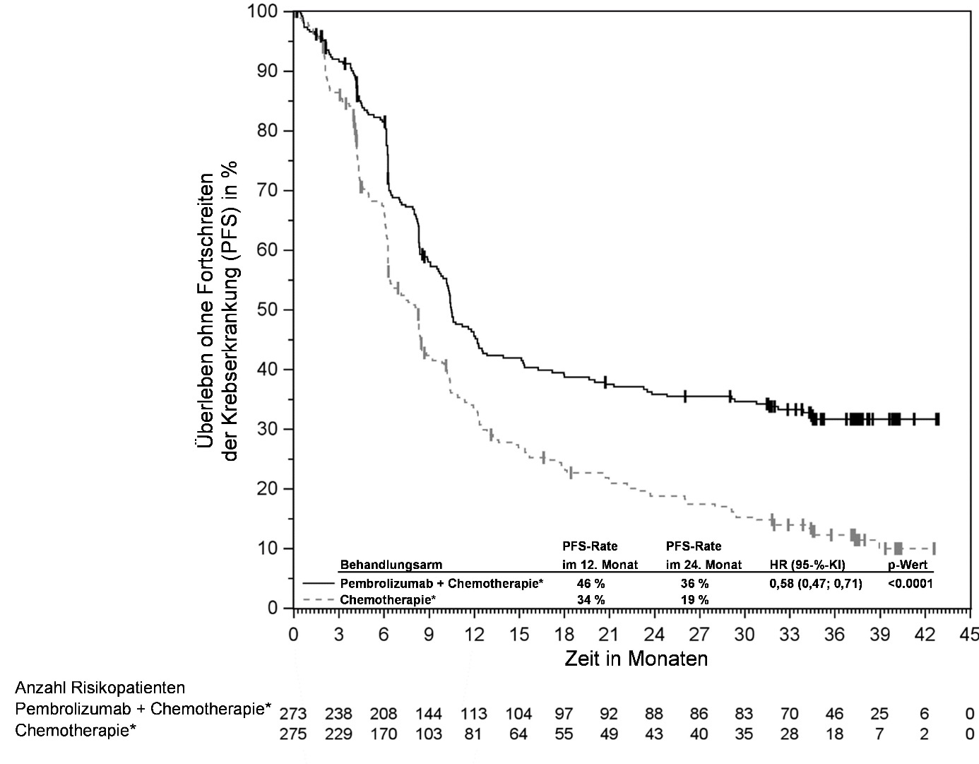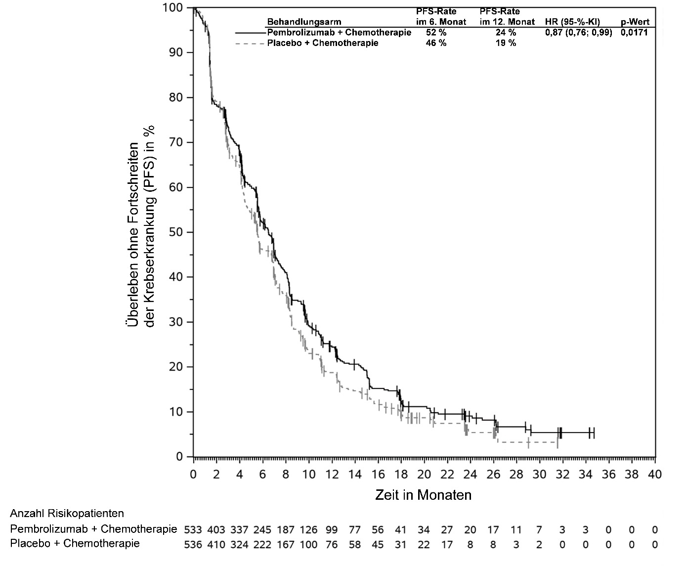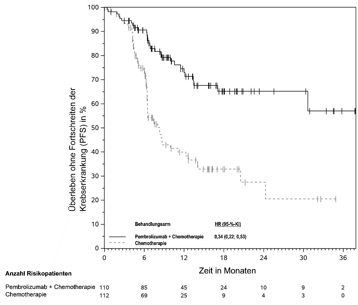 Abbildung 59: Kaplan-Meier-Kurve des Überlebens ohne Fortschreiten der Krebserkrankung (PFS) nach Behandlungsarm in KEYNOTE‑966 (Intent-to-Treat-Population)