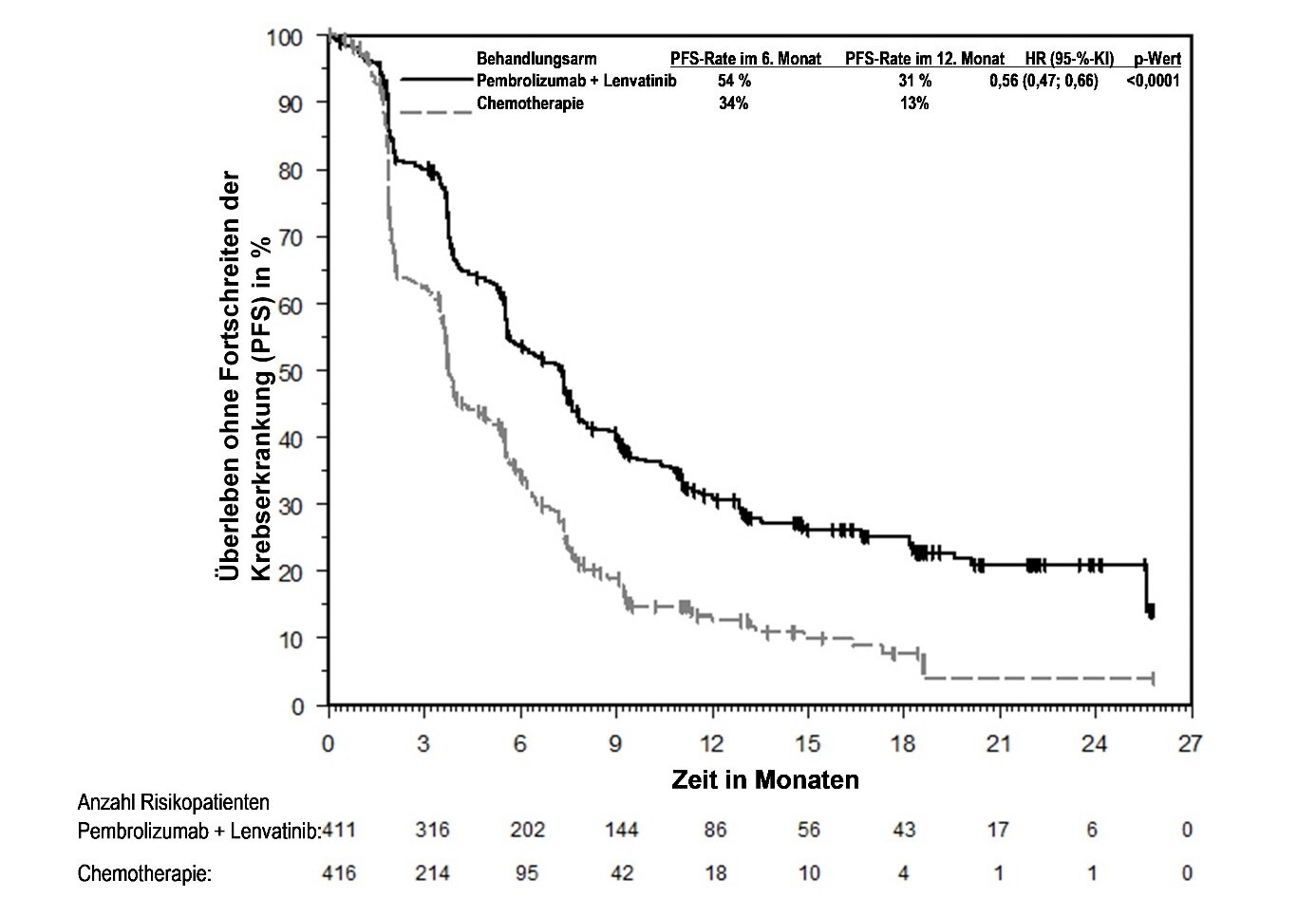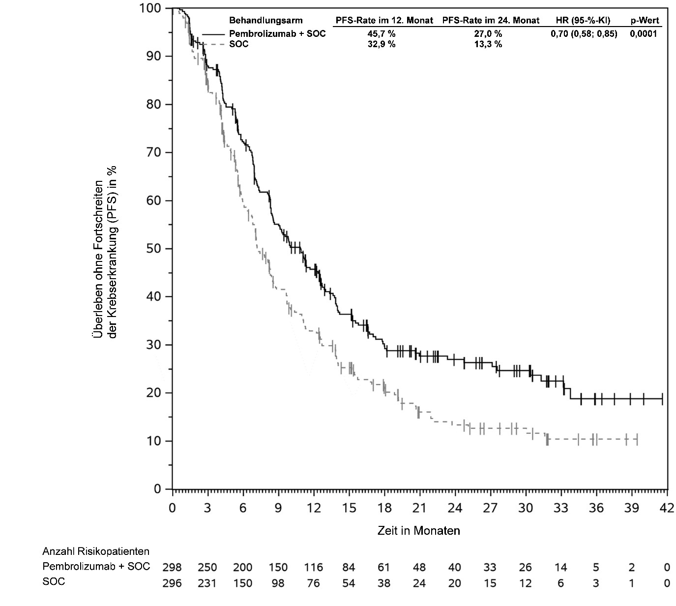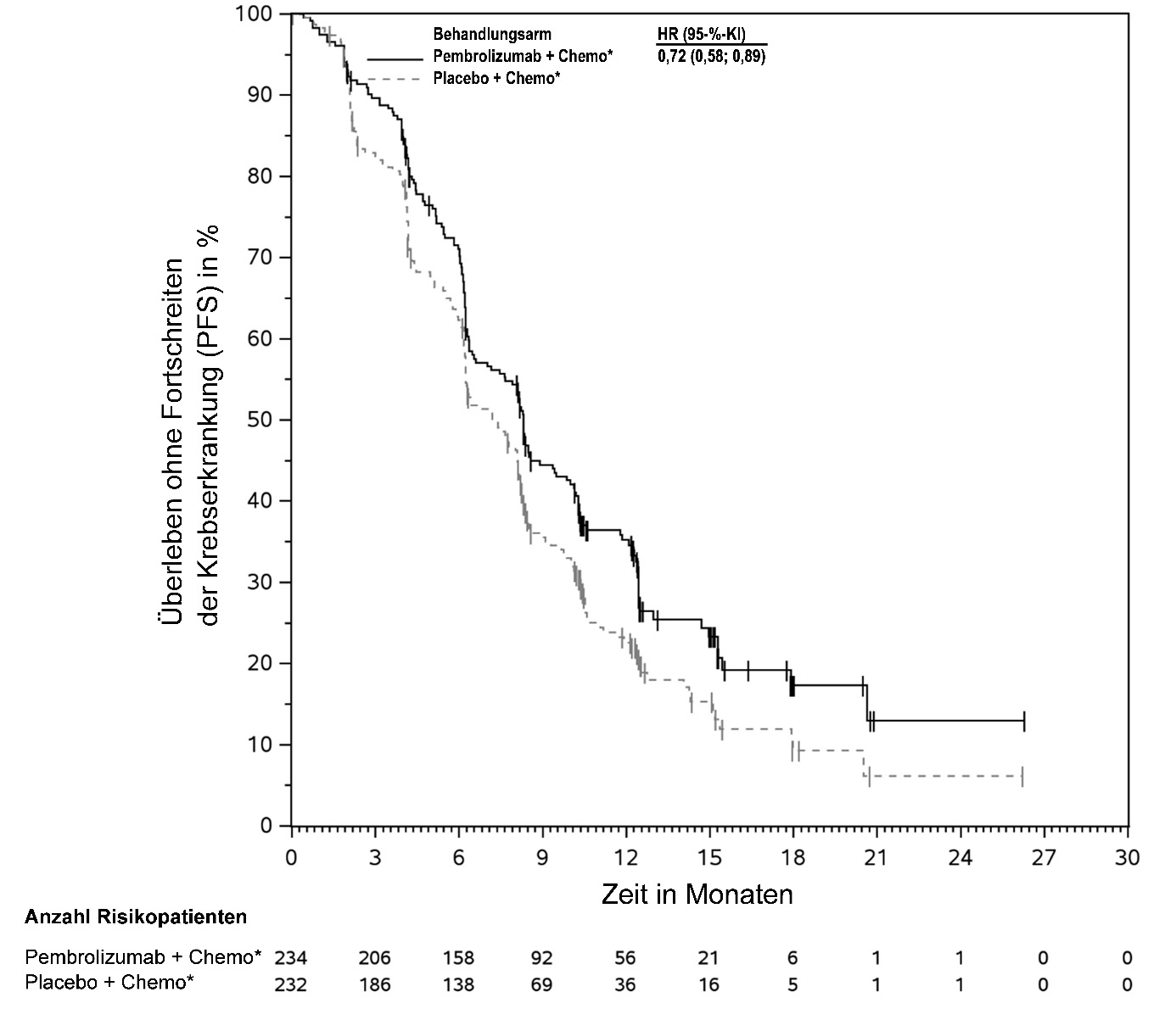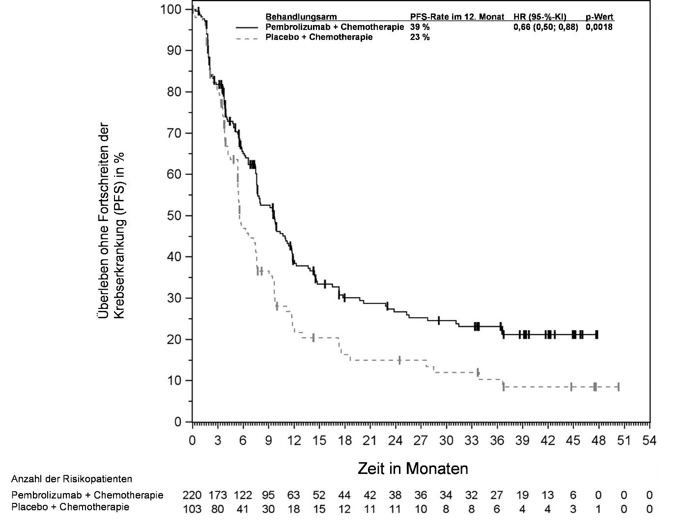 Abbildung 59: Kaplan-Meier-Kurve des Überlebens ohne Fortschreiten der Krebserkrankung (PFS) nach Behandlungsarm in KEYNOTE‑966 (Intent-to-Treat-Population)