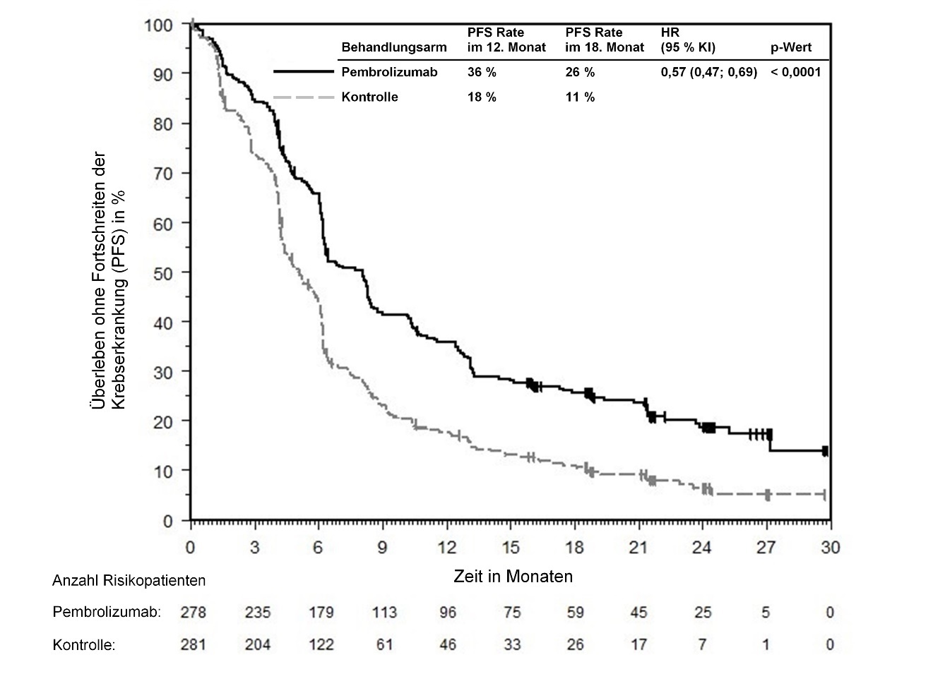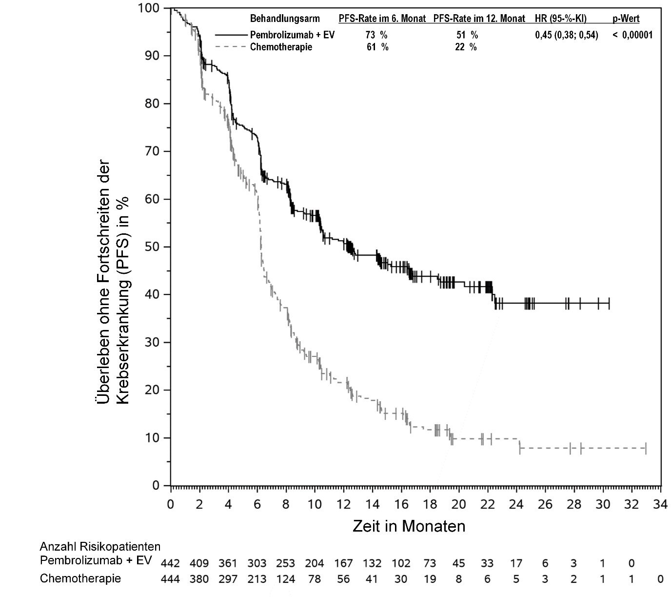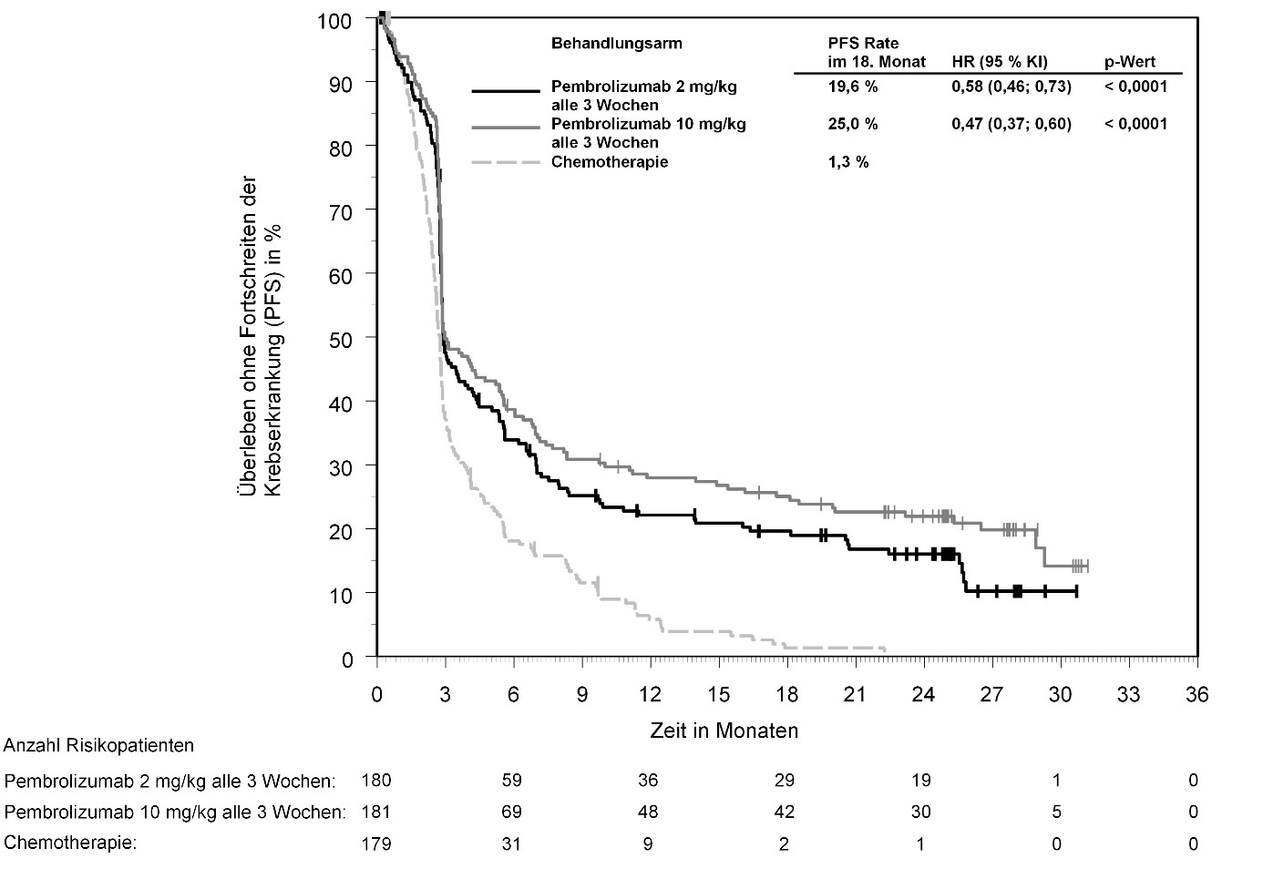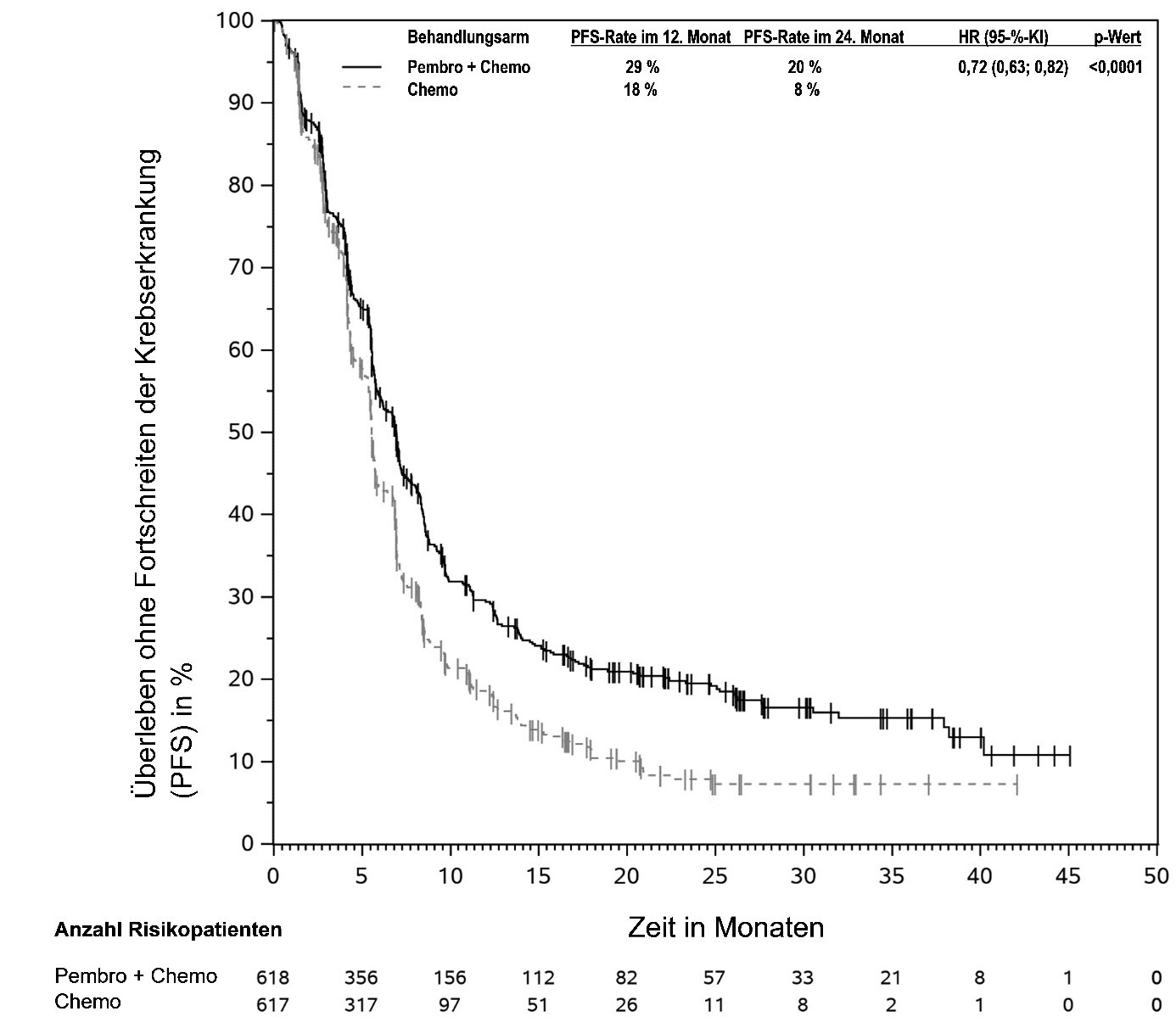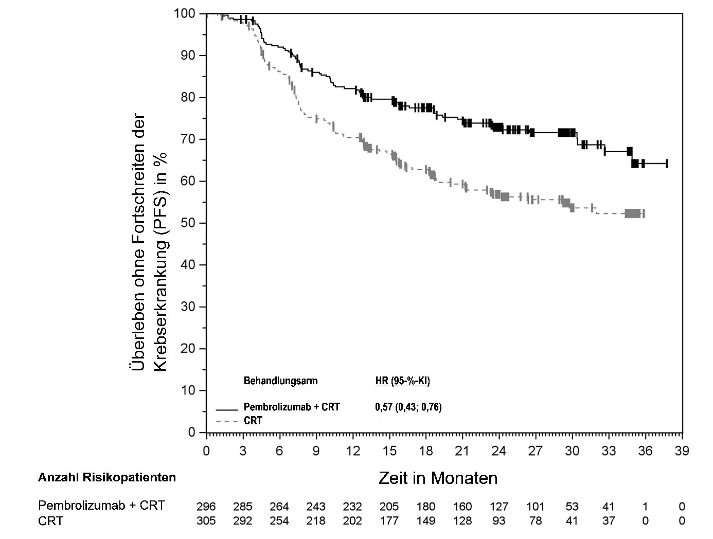 Abbildung 59: Kaplan-Meier-Kurve des Überlebens ohne Fortschreiten der Krebserkrankung (PFS) nach Behandlungsarm in KEYNOTE‑966 (Intent-to-Treat-Population)