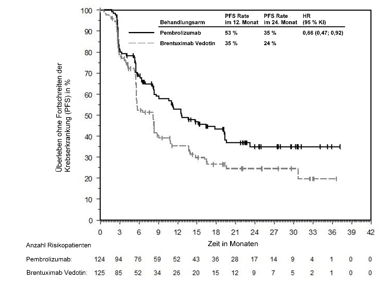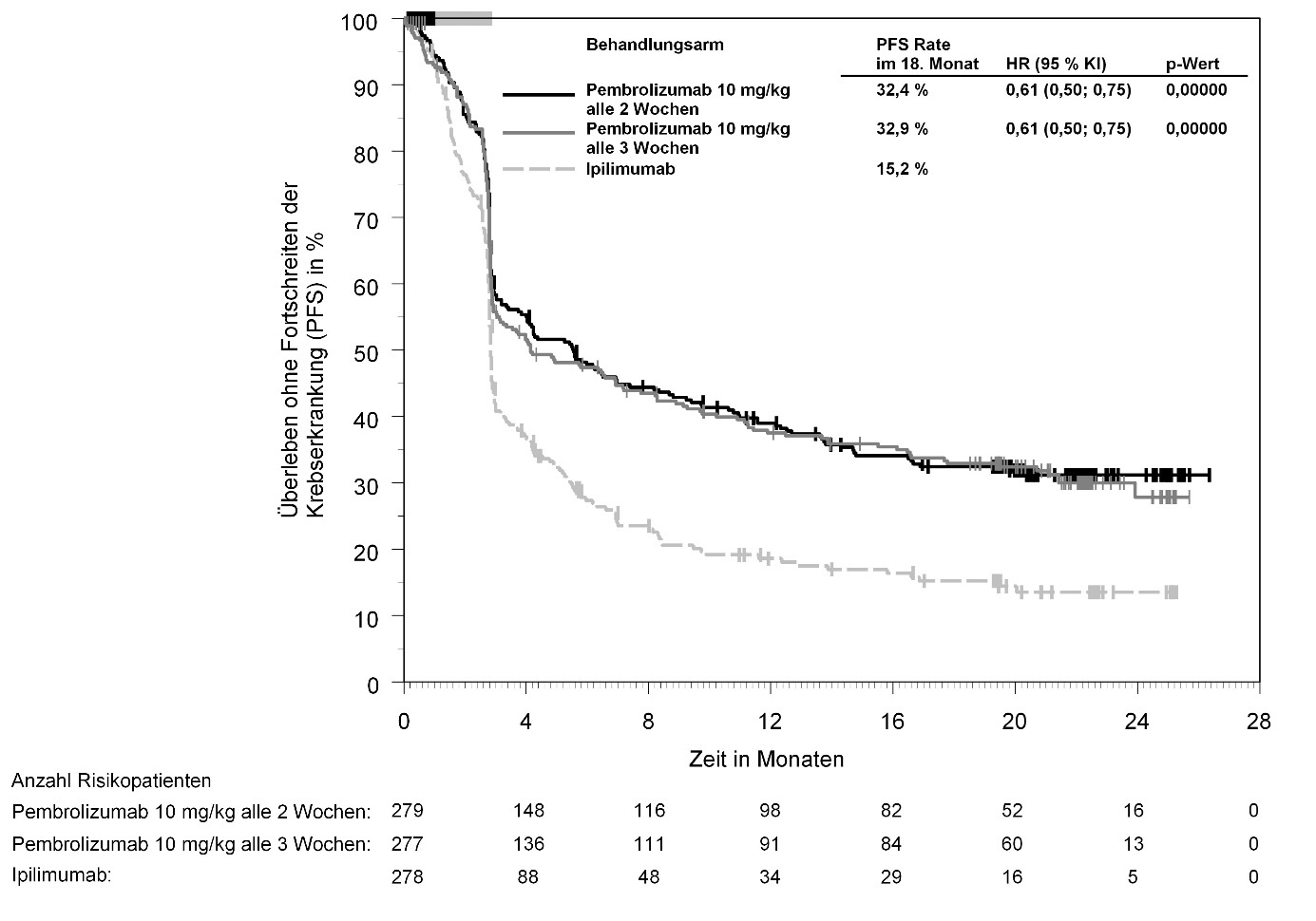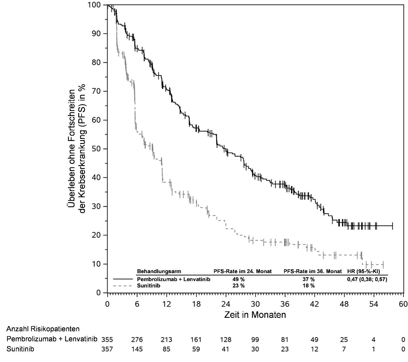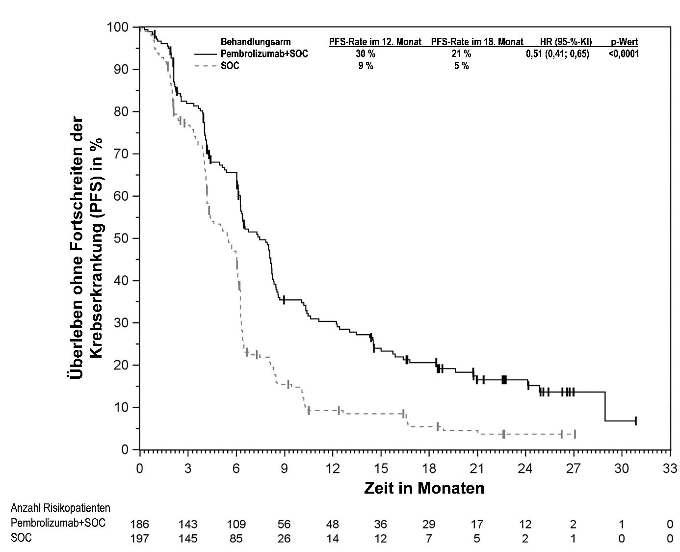 Abbildung 59: Kaplan-Meier-Kurve des Überlebens ohne Fortschreiten der Krebserkrankung (PFS) nach Behandlungsarm in KEYNOTE‑966 (Intent-to-Treat-Population)