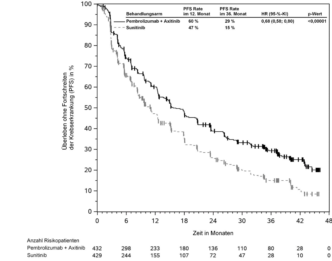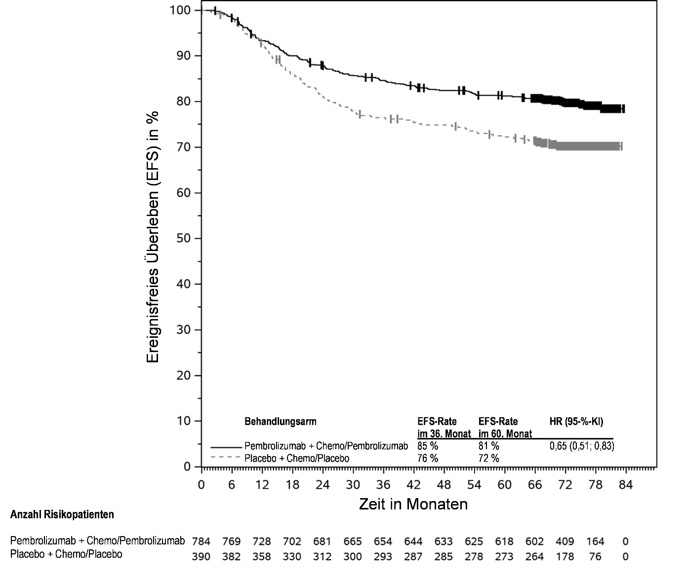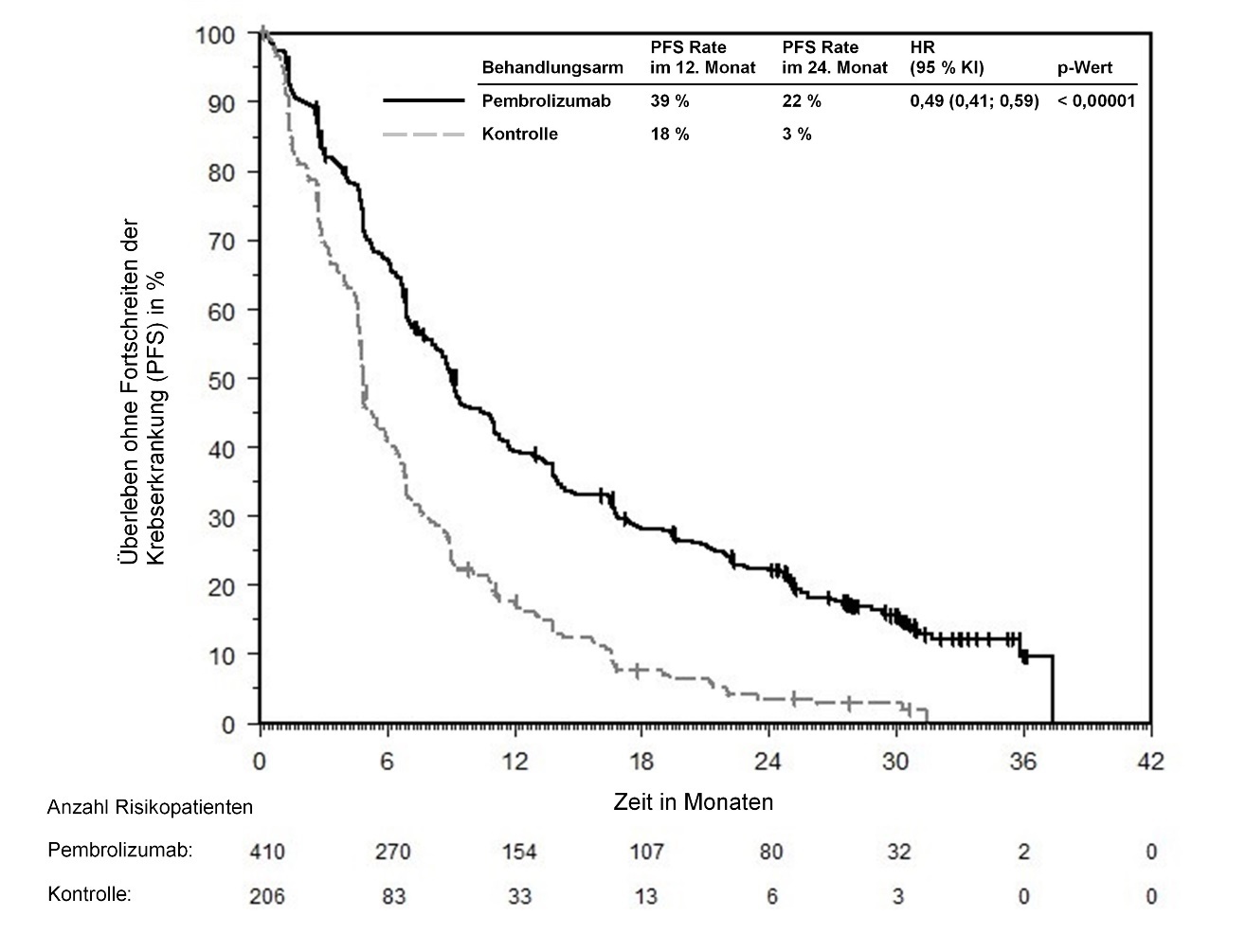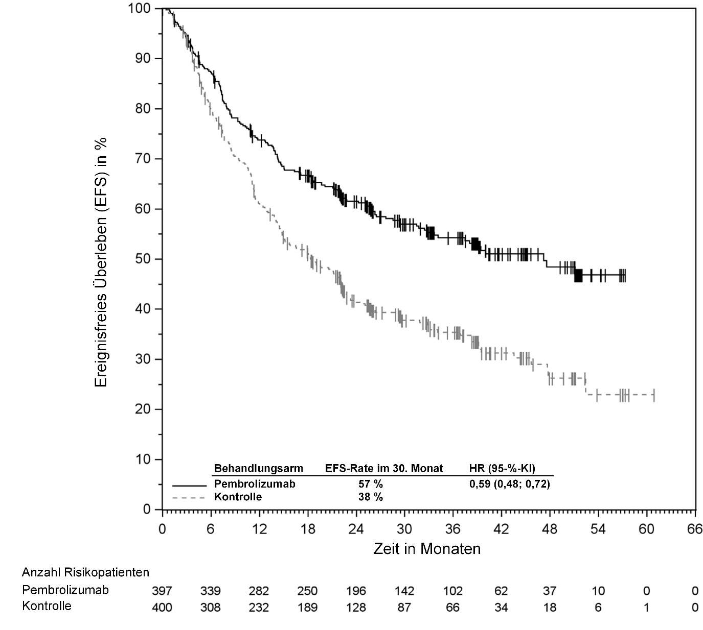 Abbildung 59: Kaplan-Meier-Kurve des Überlebens ohne Fortschreiten der Krebserkrankung (PFS) nach Behandlungsarm in KEYNOTE‑966 (Intent-to-Treat-Population)