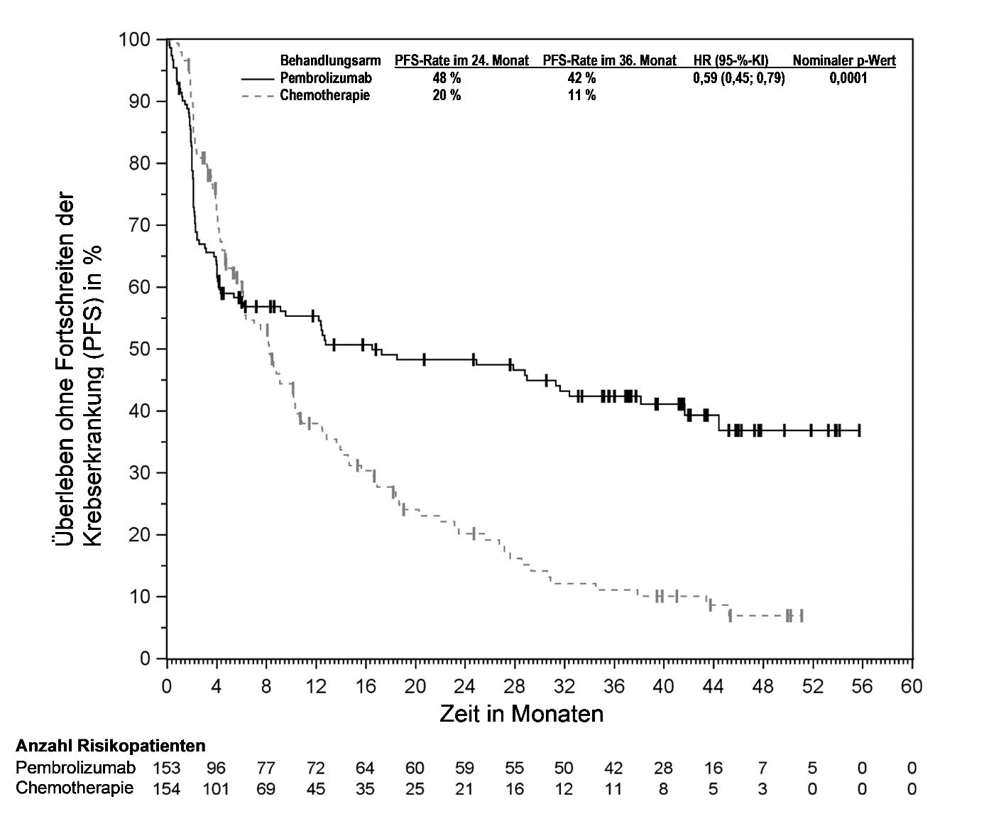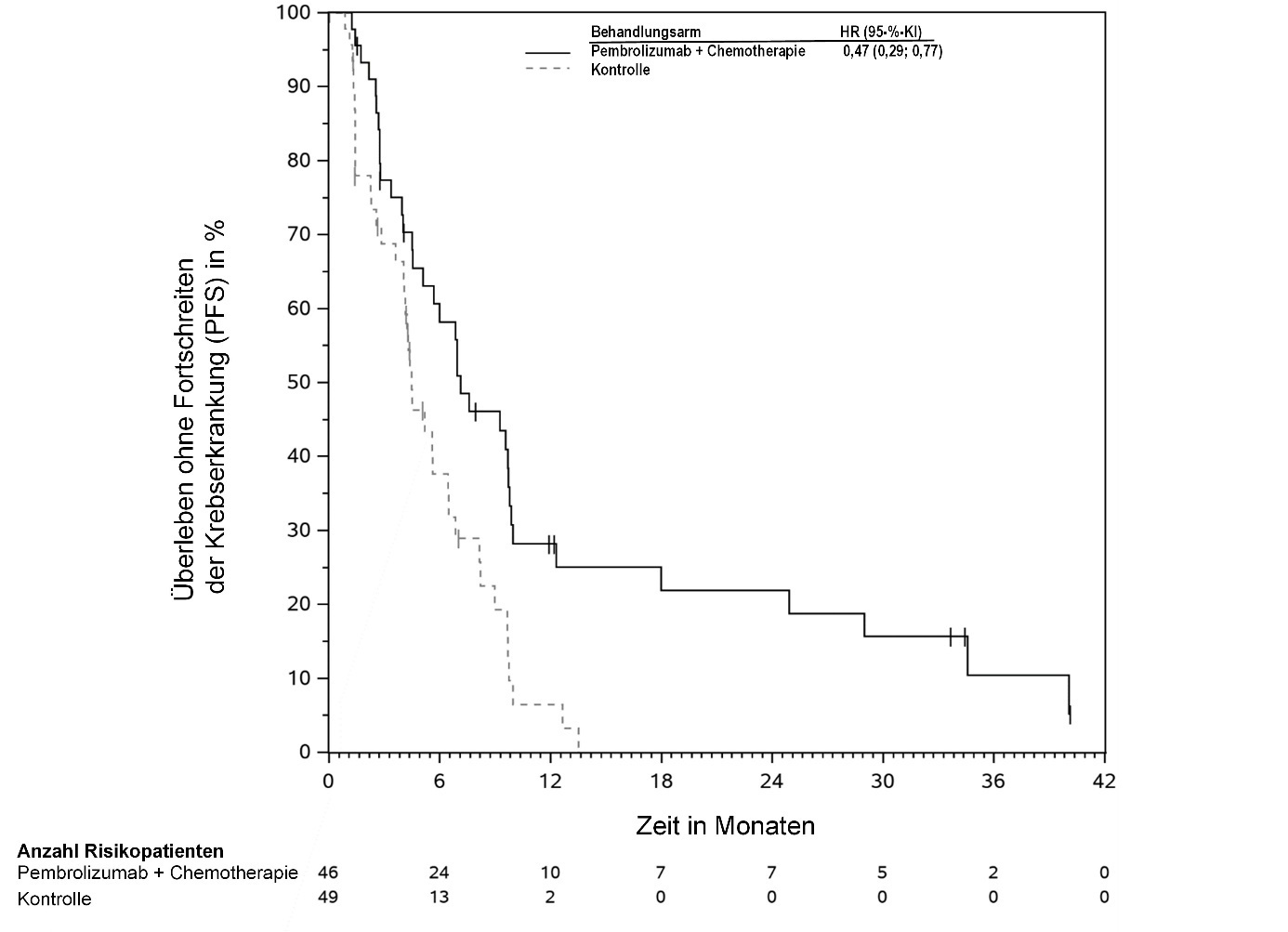 Abbildung 60: Kaplan-Meier-Kurve des Überlebens ohne Fortschreiten der Krebserkrankung (PFS) nach Behandlungsarm in KEYNOTE‑B96 für Patienten mit PD‑L1-Expression (CPS ≥ 1)