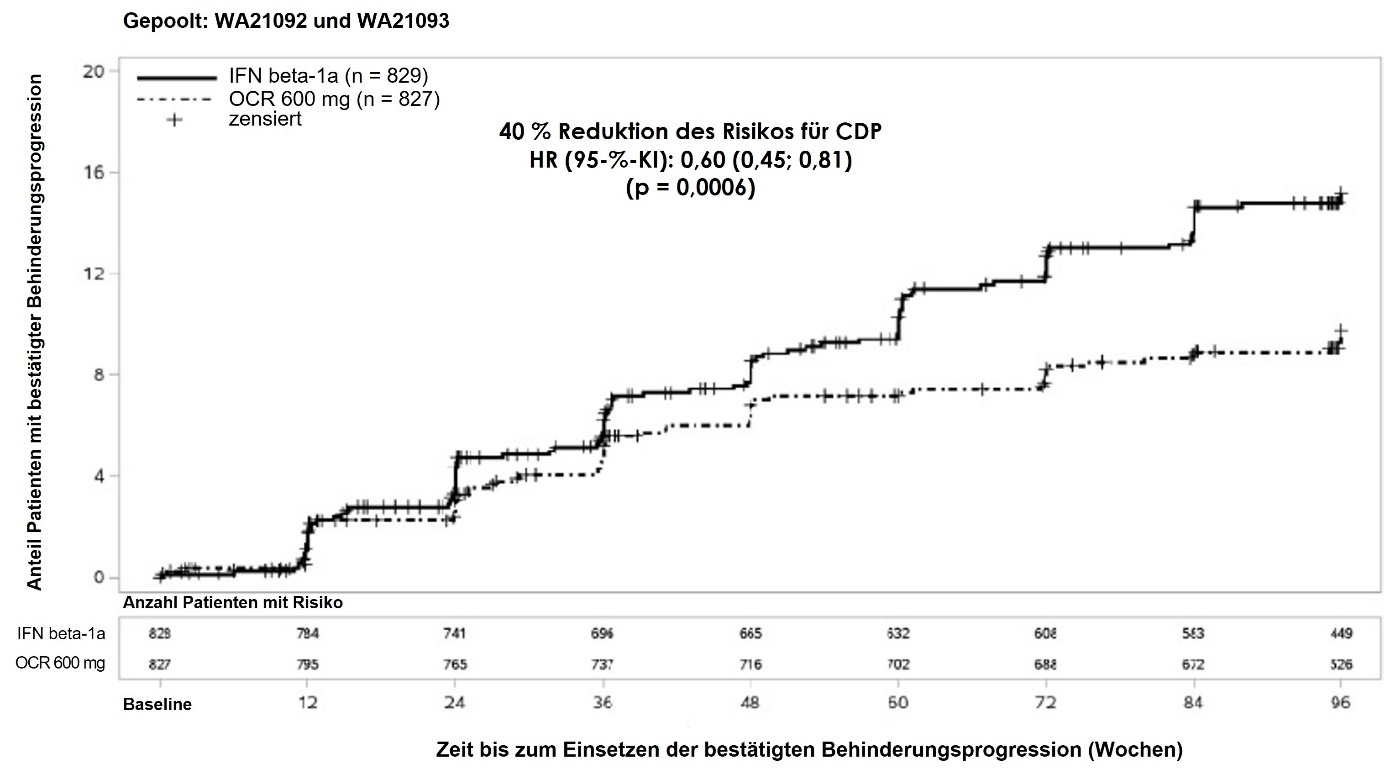 In der verlängerten Kontrollperiode (extended controlled period, ECP), die eine doppelt verblindete Behandlung und ca. 9 zusätzliche Monate kontrollierte Nachbeobachtung vor der Fortsetzung in der Open-Label Extension (OLE) oder bis zum Abbruch der Studienbehandlung beinhaltet, wurden Post-hoc-Analysen durchgeführt. Der Anteil der Patienten mit einer 24-wöchigen bestätigten Behinderungsprogression von EDSS ≥ 7,0 (24W-CDP von EDSS ≥ 7,0; Zeit bis zur Rollstuhlpflicht) betrug 9,1 % in der Placebo-Gruppe im Vergleich zu 4,8 % in der Ocrelizumab-Gruppe in Woche 144, was zu einer 47%igen Risikoreduktion der Zeit bis zur Rollstuhlpflicht (HR 0,53, [0,31; 0,92]) während der ECP führte. Da diese Ergebnisse explorativer Natur waren und Daten nach Entblindung einschlossen, sollen die Ergebnisse mit Vorsicht interpretiert werden.