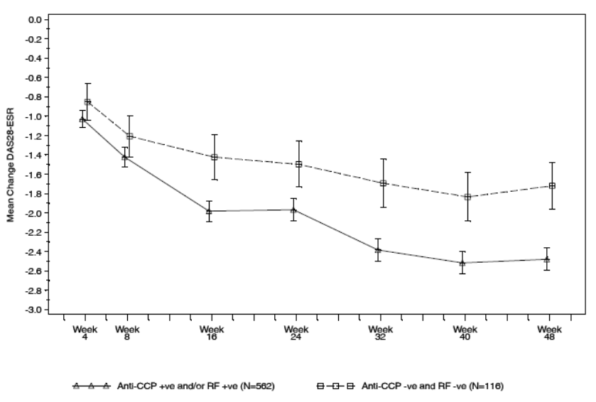 Die pharmakokinetischen Parameter in der Patientenpopulation, die ungenügend auf eine Anti-TNF-Behandlung angesprochen hatte, waren nach Anwendung des gleichen Therapieschemas (2 x 1.000 mg i.v. im Abstand von 2 Wochen) ähnlich und beliefen sich auf 369 µg/ml für die durchschnittliche maximale Serumkonzentration und 19,2 Tage für die durchschnittliche terminale Halbwertszeit.