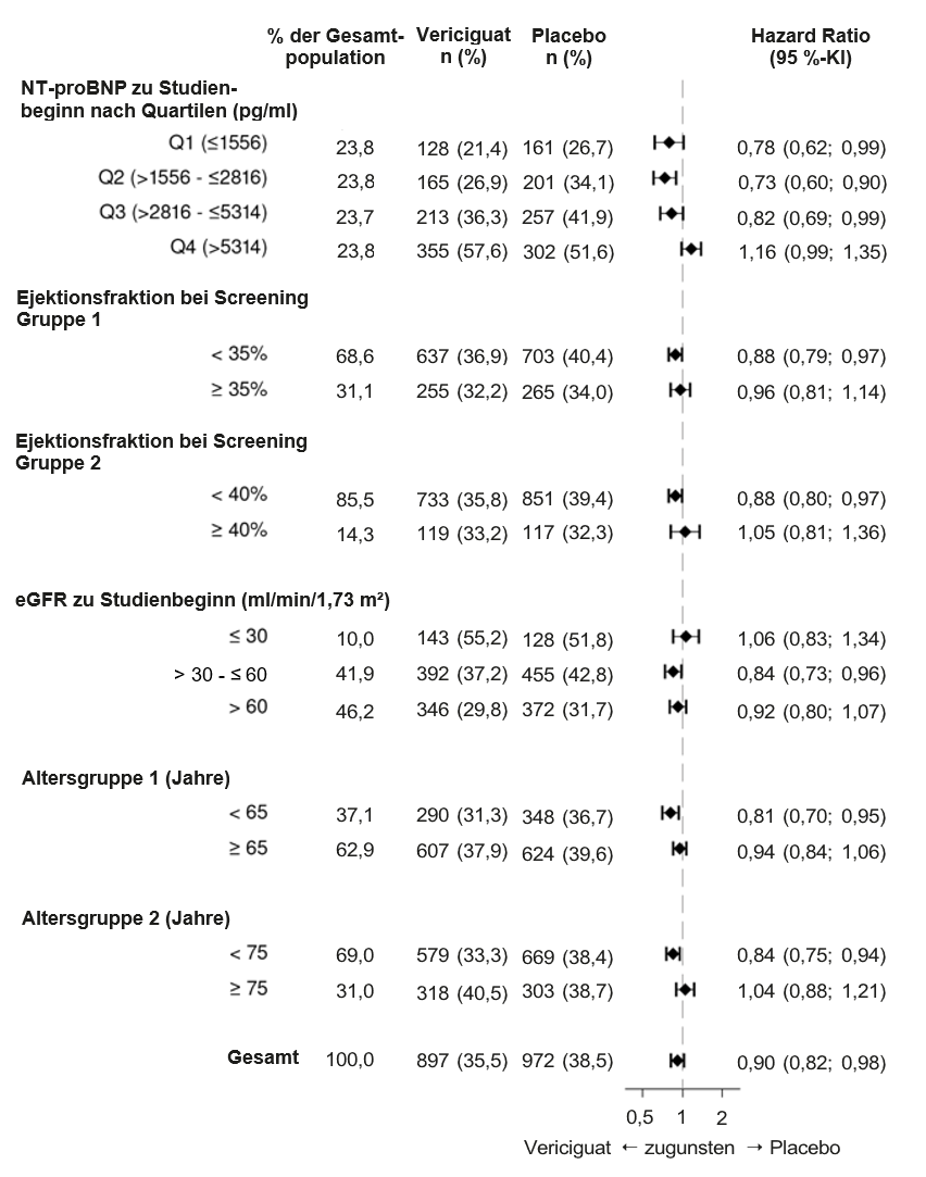 Ein breites Spektrum an demografischen Merkmalen, Einflussgrößen der Krankheit zu Studienbeginn und Begleitmedikationen zu Studienbeginn wurden auf ihren Einfluss auf den Behandlungserfolg untersucht. Die Ergebnisse bezüglich des primären kombinierten Endpunkts waren im Allgemeinen über die Subgruppen hinweg konsistent. Ergebnisse von ausgewählten vorab spezifizierten Subgruppenanalysen werden in Abbildung 2 gezeigt.