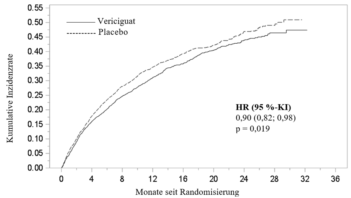 Die Sicherheit von Vericiguat wurde in einer Phase‑III-Studie (VICTORIA) untersucht, in der insgesamt 2.519 Patienten mit Vericiguat behandelt wurden (bis zu 10 mg einmal täglich) (siehe Abschnitt 5.1). Die mittlere Dauer der Vericiguat-Exposition betrug 1 Jahr und die maximale Dauer 2,6 Jahre.
