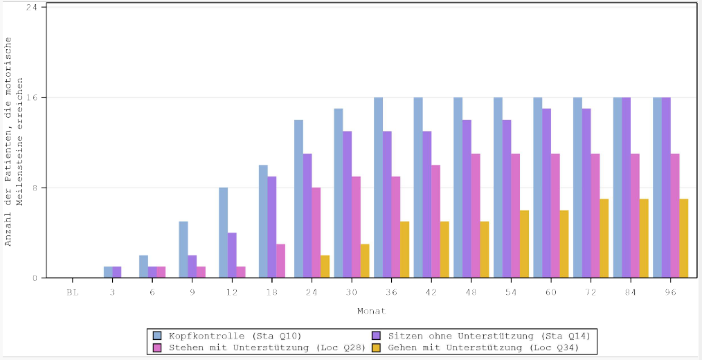 Das Erreichen von motorischen Meilensteinen wurde aus der Peabody Developmental Motor Scale, Version 2 (PDMS‑2) abgeleitet. Die PDMS‑2 ist eine Beurteilung der motorischen Entwicklung des Kindes bis zum Entwicklungsalter von 5 Jahren und bewertet sowohl die Grob- als auch die Feinmotorik, mit speziell auf das Erreichen motorischer Meilensteine bezogenen Aspekten. Die Aspekte der motorischen Fähigkeiten der PDMS‑2 wurden ausgewählt, um die Anzahl der Patienten zu bestimmen, die mindestens die folgenden motorischen Meilensteine erreichten (Beherrschung der Fähigkeit – Score von 2): 1) vollständige Kopfkontrolle (sitzt an der Hüfte gestützt und hält seinen/ihren Kopf in einer Linie, während er/sie den Kopf dreht, um einem Spielzeug 8 Sekunden lang zu folgen), 2) Sitzen ohne Unterstützung (sitzt ohne Unterstützung und hält das Gleichgewicht in der sitzenden Position für 60 Sekunden), 3) Stehen mit Unterstützung (macht mindestens 4 abwechselnde Schritte, entweder am Platz oder in einer Vorwärtsbewegung, wobei die Hand des Beurteilers auf dem Rumpf des Kindes liegt) und 4) Gehen mit Unterstützung (geht mindestens 8 Fuß [2,5 Meter] mit abwechselnden Schritten, wobei der Beurteiler sich seitlich des Patienten befindet und nur eine Hand des Kindes hält).
