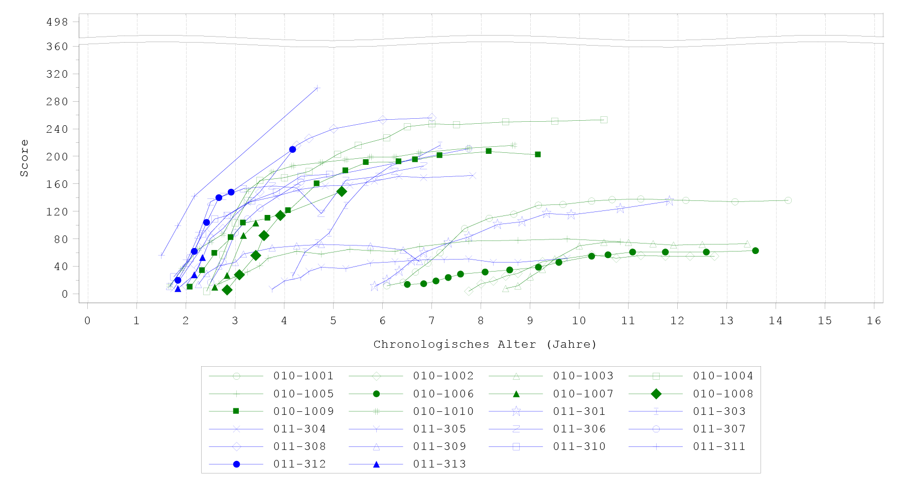 Abbildung 3 PDMS‑2-Gesamtscores nach Besuch – bis Monat 96 (Studien AADC‑010, AADC‑011 und AADC‑1602; N = 22)