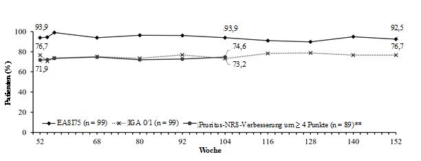 a In Woche 16, Patienten mit einem IGA von 0 oder 1 („erscheinungsfrei“ oder „fast erscheinungsfrei“) mit einer Reduktion um ≥ 2 Punkte gegenüber Baseline auf einer IGA-Skala von 0–4 oder Reduktion des EASI um 75 % oder 90 % von Baseline bis Woche 16. | ||||||