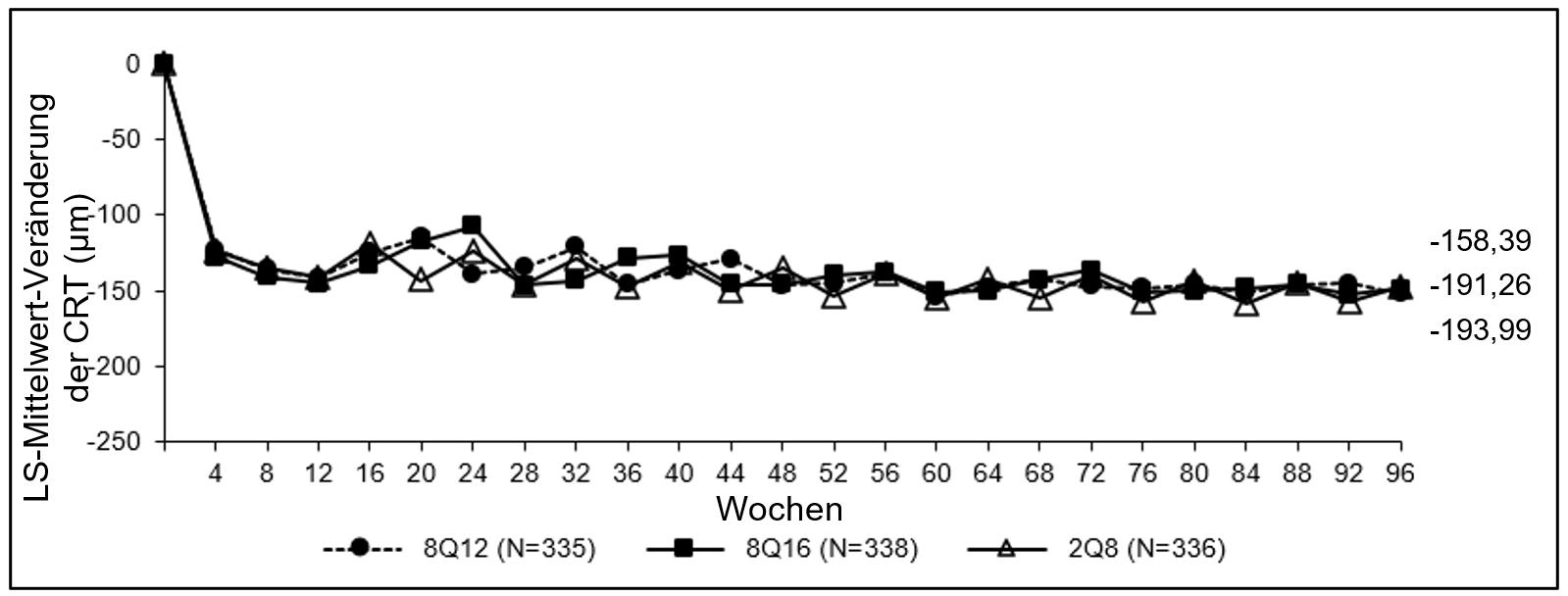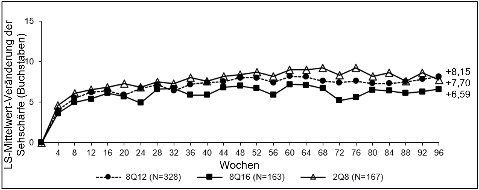 Wenn sich der funktionelle und/oder morphologische Befund verschlechtert, sollte das Behandlungsintervall nach Ermessen des Arztes entsprechend verkürzt werden. Das kürzeste Intervall zwischen 2 Injektionen beträgt in der Erhaltungsphase 2 Monate.