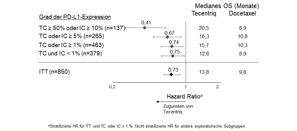 Tecentriq als Monotherapie wird angewendet bei erwachsenen Patienten zur Erstlinienbehandlung des metastasierten NSCLC, deren Tumoren eine PD-L1-Expression ≥ 50 % der TC oder ≥ 10 % bei tumorinfiltrierenden Immunzellen (immune cells, IC) aufweisen und die kein EGFR-mutiertes oder ALK‑positives NSCLC haben (siehe Abschnitt 5.1).