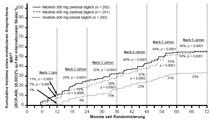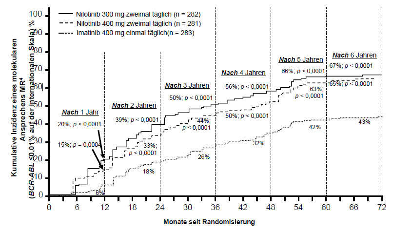 Die mittels der Kaplan-Meier-Methode geschätzte mediane Zeit unter der Behandlung mit Nilotinib bis zum Wiedererlangen einer MR4 und MR4,5 betrug 11,1 Wochen (95%‑KI: 8,1; 12,1) bzw. 13,1 Wochen (95%‑KI: 12,0; 15,9). Die kumulative Rate der wiedererlangten MR4 und MR4,5 nach 48 Wochen nach Wiederaufnahme der Behandlung betrug 94,9 % (56/59 Patienten) bzw. 91,5 % (54/59 Patienten