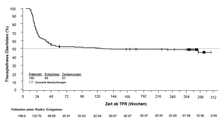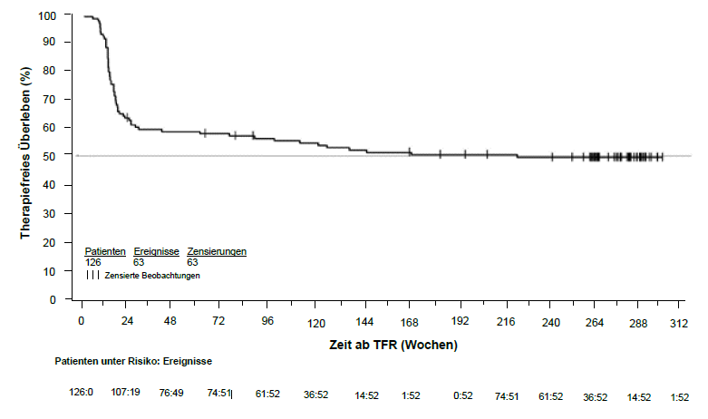 Das mittels der Kaplan-Meier-Methode geschätzte mediane therapiefreie Überleben (treatment-free survival, TFS) betrug 224 Wochen (95%‑KI: 39,9; nicht abschätzbar [NA]) (Abbildung 5); bei 63 von 126 Patienten (50,0 %) ist kein TFS-Ereignis eingetreten.