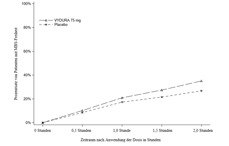 In Studie 1 war der Prozentsatz von Patienten, die 2 Stunden nach einer Einzeldosis Kopfschmerzfreiheit und MBS-Freiheit erreichten, bei den Patienten, die VYDURA erhielten, statistisch signifikant höher als bei den Patienten, die das Placebo erhielten (Tabelle 2). Außerdem wurden statistisch signifikante Wirkungen von VYDURA im Vergleich zu Placebo für die zusätzlichen Wirksamkeitsendpunkte Schmerzlinderung nach 2 Stunden, anhaltende Schmerzfreiheit von 2 bis 48 Stunden, Anwendung von Notfallarzneimitteln innerhalb von 24 Stunden und Fähigkeit, 2 Stunden nach der Einnahme normal zu funktionieren, nachgewiesen. Schmerzlinderung war definiert als ein Rückgang der Migräneschmerzen von mittelstarken oder starken Schmerzen auf leichte oder gar keine Schmerzen. Die zulassungsrelevanten doppelblinden, placebokontrollierten Studien 2 und 3 zur Untersuchung von einzelnen Migräneattacken wurden an Migränepatienten durchgeführt, die eine bioäquivalente Darreichungsform von 75 mg Rimegepant erhielten.
