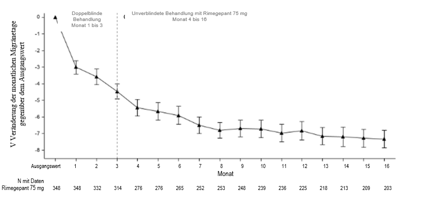 Die an Studie 4 teilnehmenden Patienten hatten die Möglichkeit, für weitere 12 Monate an einer offenen Verlängerungsstudie teilzunehmen. In der offenen Verlängerungsstudie, in der Patienten Rimegepant 75 mg jeden zweiten Tag erhielten sowie je nach Bedarf an nicht geplanten Behandlungstagen, wurde die Wirksamkeit für bis zu 1 Jahr aufrechterhalten (Abbildung 4). Ein Teil der Teilnehmer, bestehend aus 203 Patienten, die Rimegepant zugewiesen waren, beendete den insgesamt 16-monatigen Behandlungszeitraum. Bei diesen Patienten betrug die durchschnittliche Gesamtabnahme der Anzahl der MMDs gegenüber dem Ausgangswert im Verlauf des 16-monatigen Behandlungszeitraums durchschnittlich 6,2 Tage.