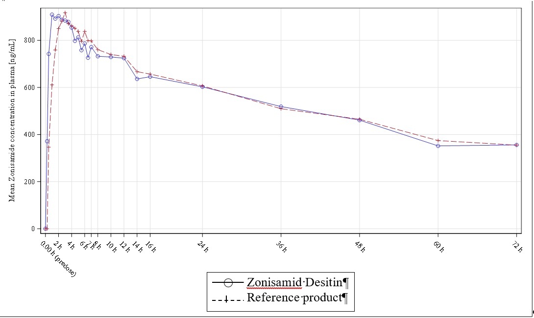 Der Zeitverlauf der Plasmakonzentration beider getesteter Produkte war fast deckungsgleich (Abbildung 1). In Bezug auf die maximale Plasmakonzentration (Cmax) und die Fläche unter der Kurve (AUC) war Zonisamid Desitin im Vergleich zum Referenzprodukt bioäquivalent. Für Cmax betrug der mittlere Quotient 98,6 % mit einem 90%igen Konfidenzintervall von 94,5 % bis 102,8 %. Der mittlere Quotient für AUC(0-72) war 98,7 % mit einem 90%igen Konfidenzintervall von 96,1 % bis 101,4 %.