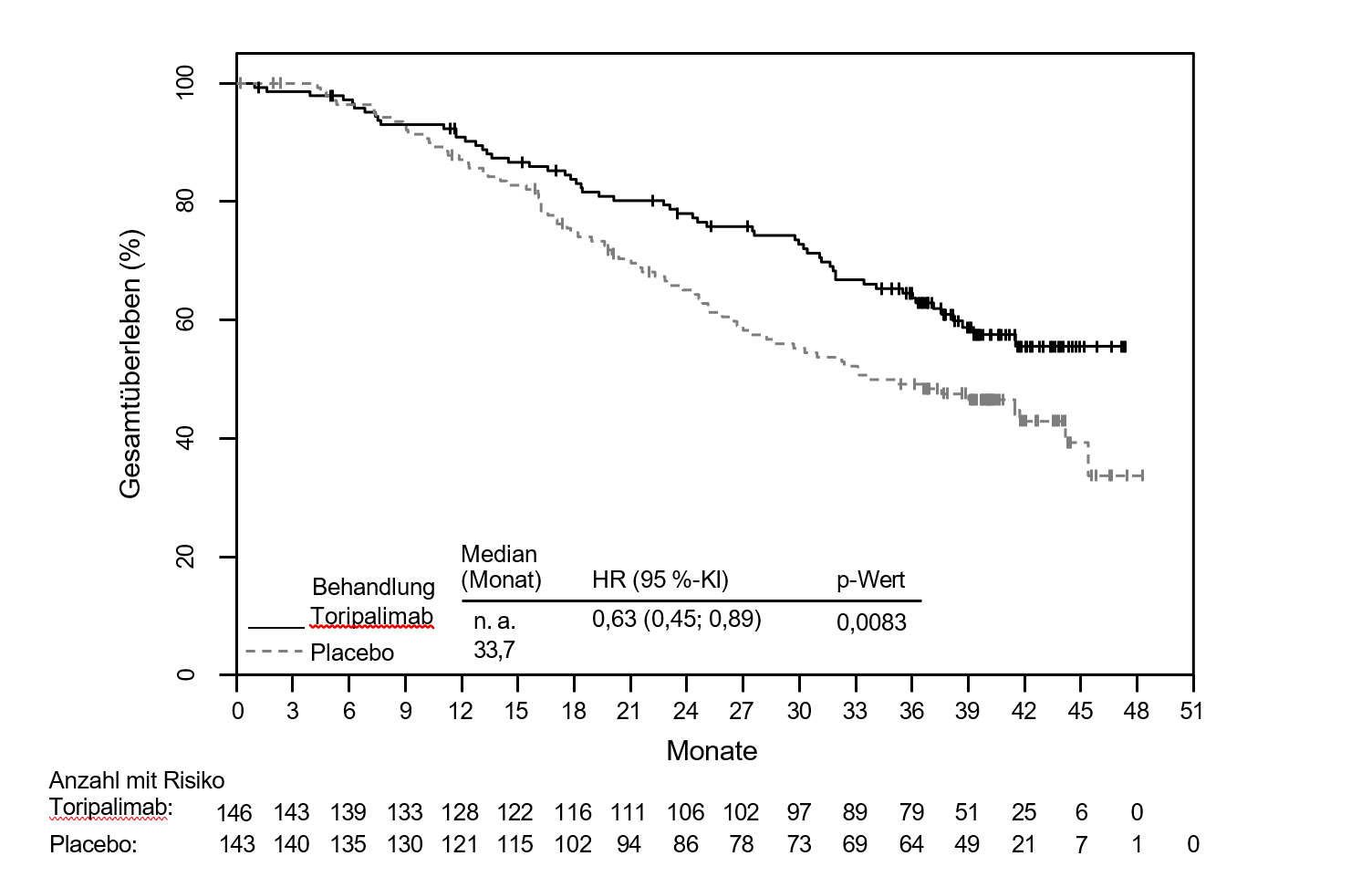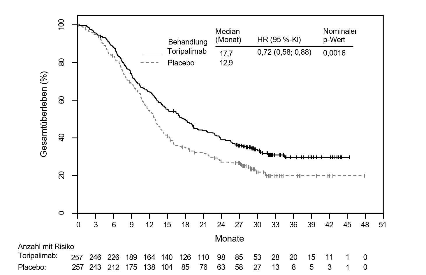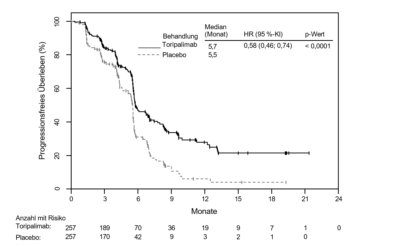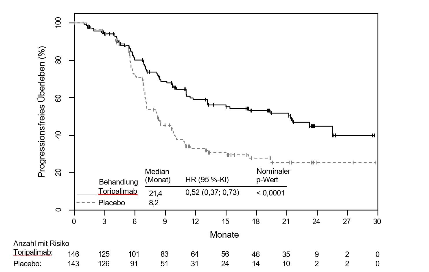 Die Behandlung mit Toripalimab oder Placebo wurde bis zum Fortschreiten der Krankheit gemäß RECIST Version 1.1, dem Auftreten inakzeptabler Toxizität oder maximal 2 Jahre lang fortgesetzt. Tumorbeurteilungen wurden in den ersten 12 Monaten alle 6 Wochen und danach alle 9 Wochen durchgeführt. Die co-primären Endpunkte waren das progressionsfreie Überleben (PFS) gemäß RECIST Version 1.1 per Beurteilung durch einen verblindeten unabhängigen Prüfausschuss (Blinded Independent Review Committee, BIRC) und das OS.